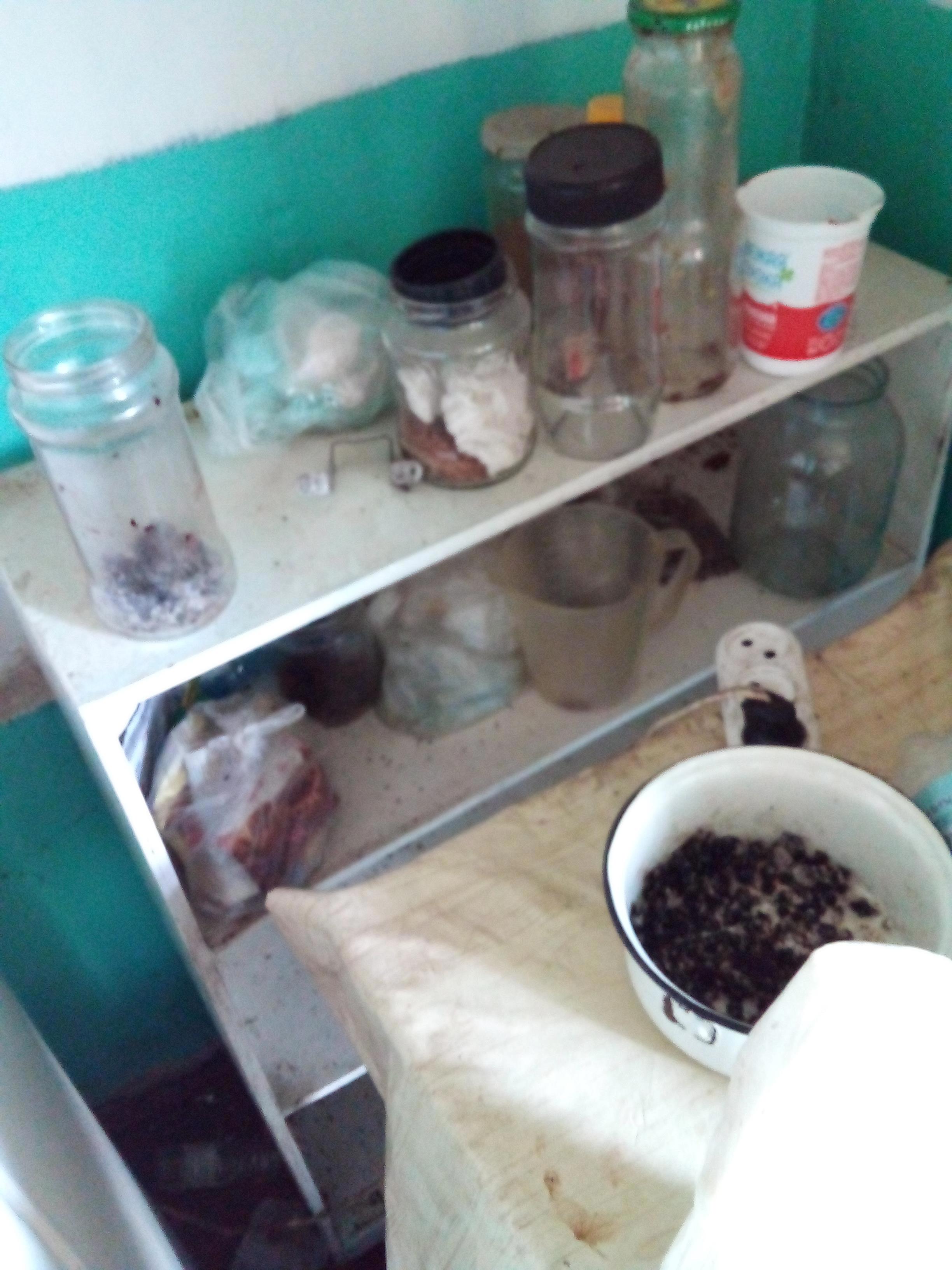 Стол около печи. Под ним нашлось множество пустых блистеров из-под таблеток — ими бабуля плотно закинулась в момент помрачения.