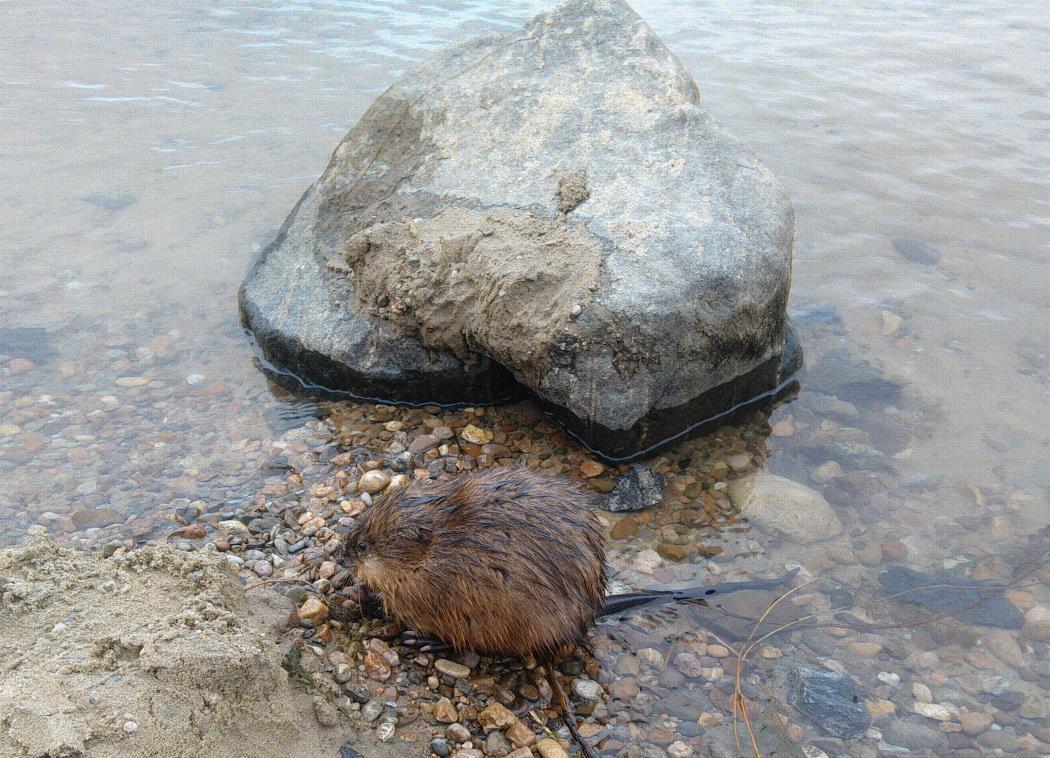 Проплыв метров пятьдесят, ондатра сдалась, выбрала пару камней побольше и вылезла между ними. На её морде было крупно написано: «Хрен с вами, фотайте!» Возможно, она даже, как тот ондатр из Мумми-Тролля, думала, что всё в мире бренно, не знаю.