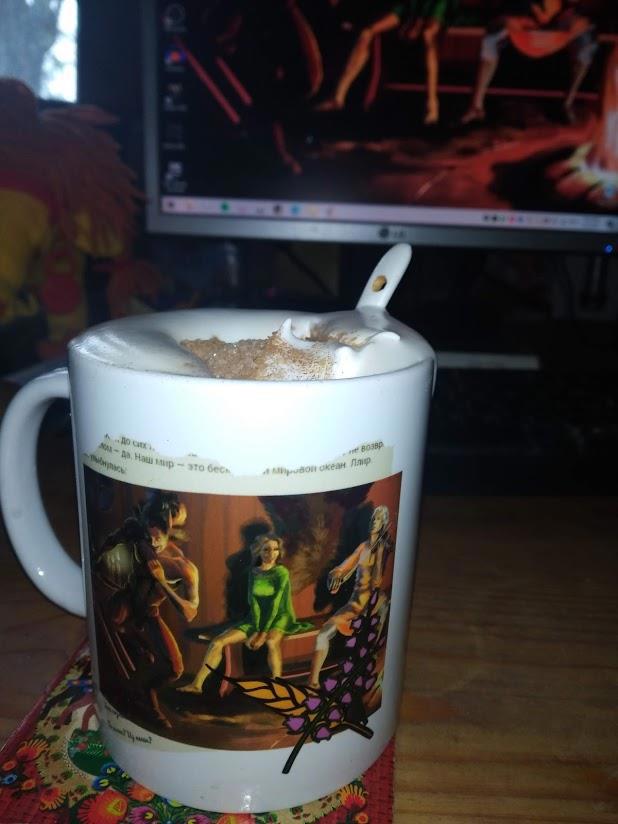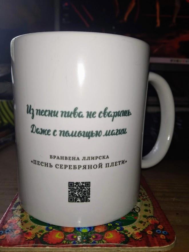 Кружка с не менее восхитительной иллюстрацией к «Серебряной Плети» кисти прекрасной Ольги Морох, две недели назад заказанная через сервис Canva, что кажется просто невероятным, пришла вчера точно к утреннему кофе. Я уже извлекла из буфета обычную старую кружку с совами, сняла с плиты турку и... Подкатила машина курьерской службы. Так что кофе был особенно вкусным!