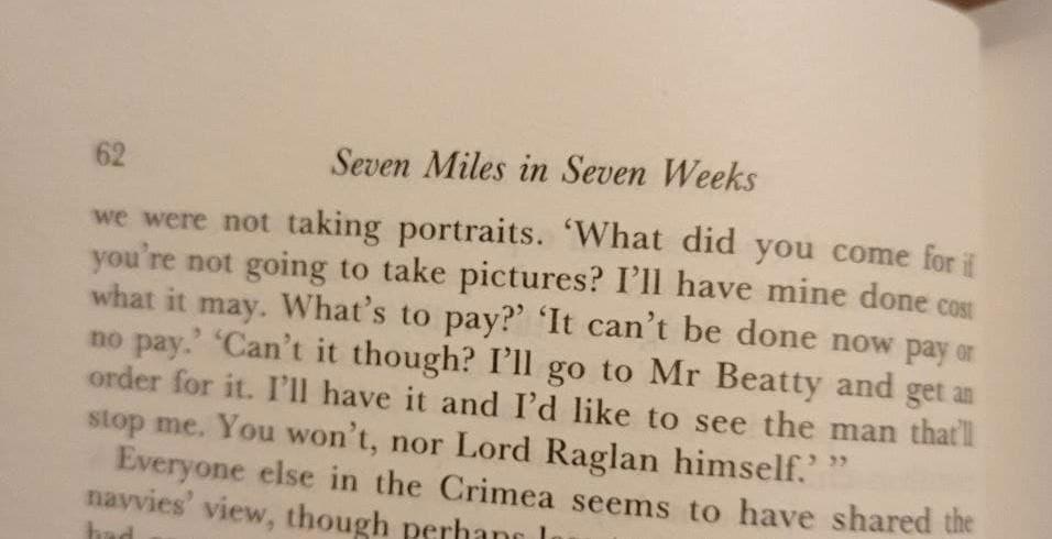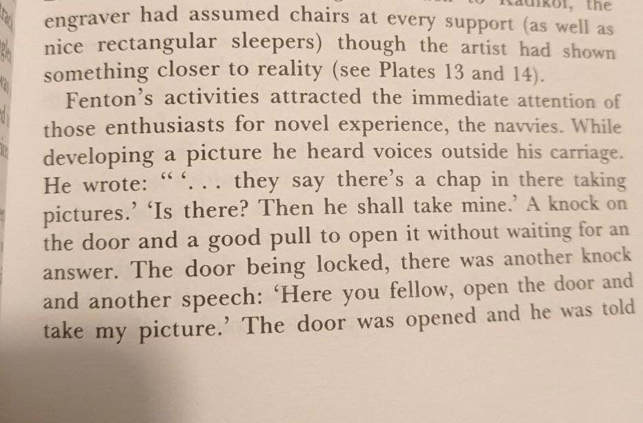 Я значит, вставляю историю про то, как к фотографу, которого прислали во время Крымской войны из Англии все в Балаклаве фотографироввать (и благодаря которому у нас, ДА, действительно до сих пор есть кое-какие кадры из там и тогда), так вот, история была такая - он сидит в своей кабине, которую припер с собой, потому что она изнутри обшита толстыми тряпками, чтобы там было ДЕЙСТВИТЕЛЬНО темно - и вот он внутри сидит, а к нему пришли землекопы, стройбат, биттины работнички, стали требовать, чтобы он открыл и наделал им пааартретов, а когда он не стал - сломали дверь.