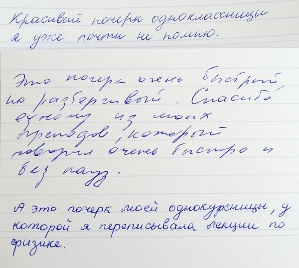 Я мало пишу от руки (как и все, я полагаю), поэтому почерков стало заметно меньше)) Почерк одноклассницы уже не могу повторить, он был более мягким, а у меня острый (хотя это очень зависит от настроения). У однокурсницы был более приплюснутый и ровный. А в середине — это моё ноу-хау — его я часто использую. Препод никогда не останавливался и не повторял, игнорируя слёзные просьбы студентов, поэтому пришлось учиться писать очень быстро.