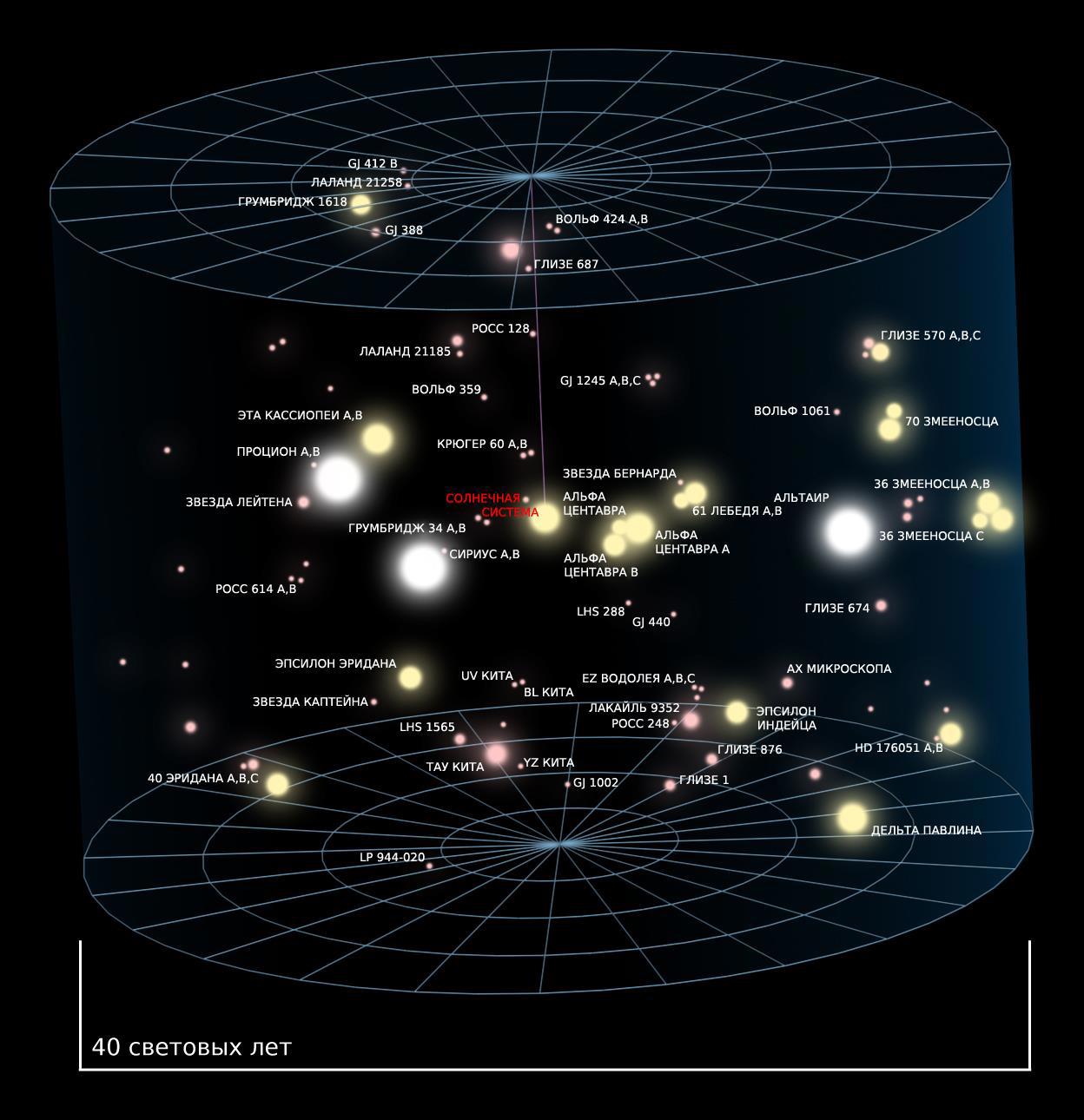 В пределах десяти св. лет (95 трлн км) от Солнца звёзд относительно немного.
