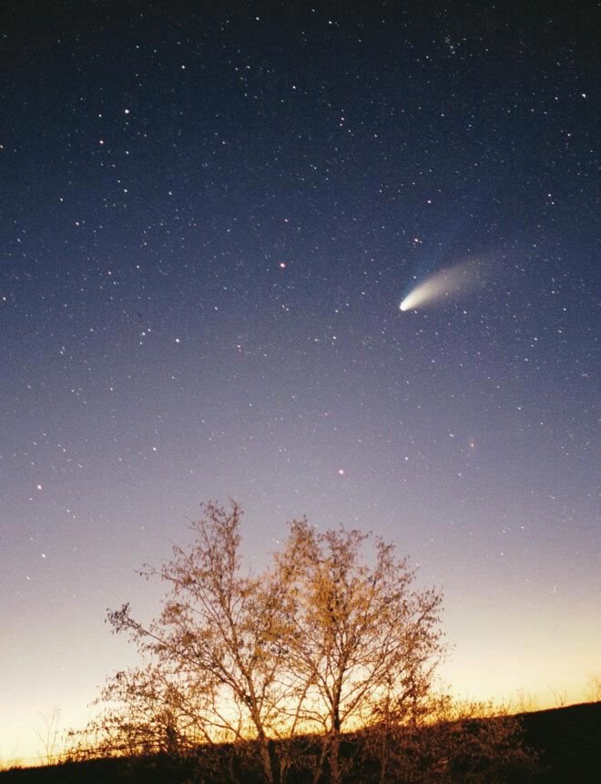 Кометы — малые тела Солнечной системы, обычно размером всего в несколько километров, состоящие главным образом из летучих веществ (льдов). Их орбиты имеют большой эксцентриситет, как правило, с перигелием в пределах орбит внутренних планет и афелием далеко за Плутоном. Когда комета входит во внутреннюю область Солнечной системы и приближается к Солнцу, её ледяная поверхность начинает испаряться и ионизироваться, создавая кому — длинное облако из газа и пыли, часто видимое с Земли невооружённым глазом.
