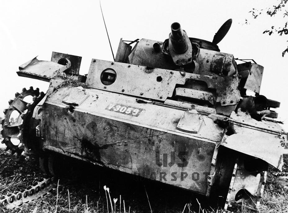 Разутый и разбитый Т-4. Характерный пролом - пробоина от снаряда, попавшего в нижний лобовой лист брони.