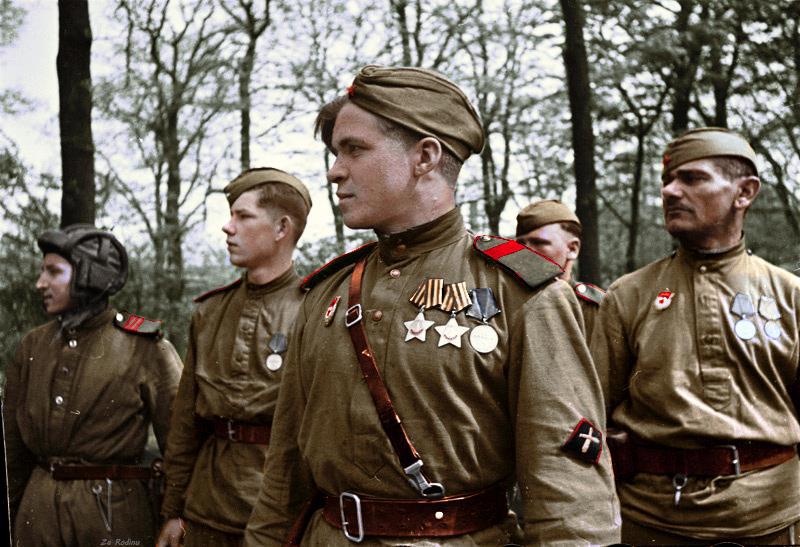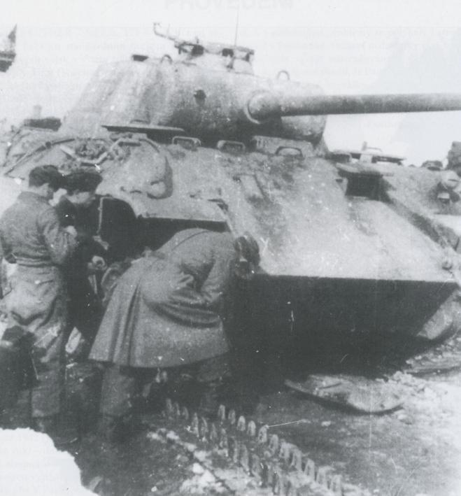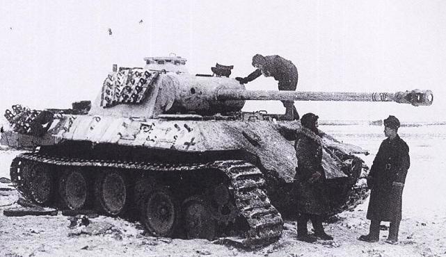 Бойцы осматривают подбитую Пантеру. Характерны траки, навешанные как доп броня.