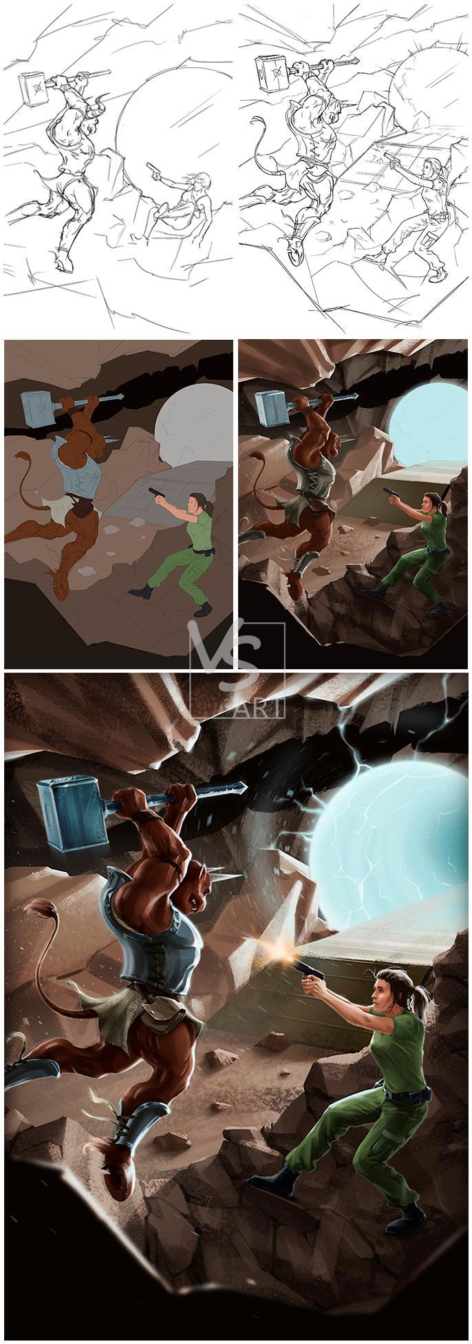 Автор: Салихов ВасильЭто пример одной из самых стандартных, в плане процесса, работ. Заказчик подготовил ТЗ, пара эскизов с уточнением и работа в цвете с небольшой корректировкой. Мы с автором полностью поняли друг друга и получился, на мой взгляд, отличный арт для обложки. Главное было задать динамику сцены и неочевидность исхода.