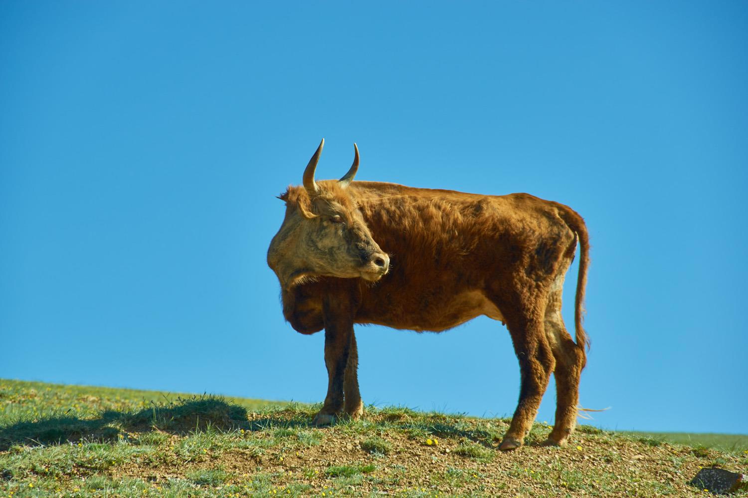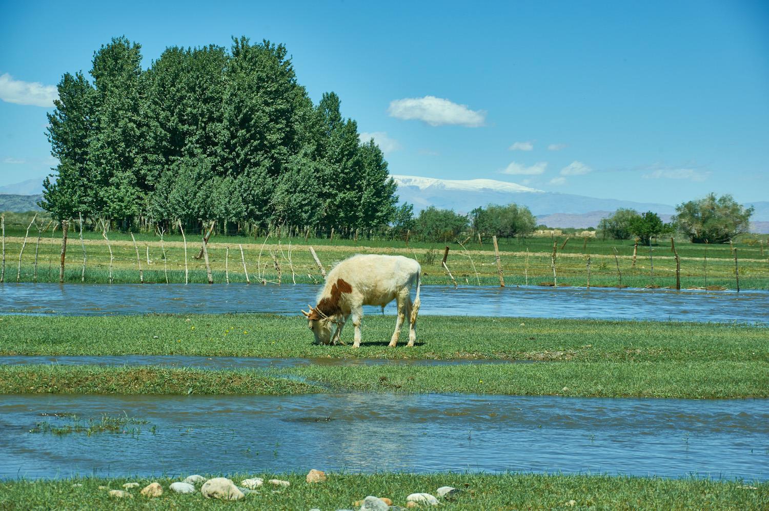 В зеленой зоне, где много зелени появляются бычки. Этот с удовольствием пасется около разлившейся реки. Как ни странно, но самые сложные в преодолении места вовсе не пустыни, а броды.