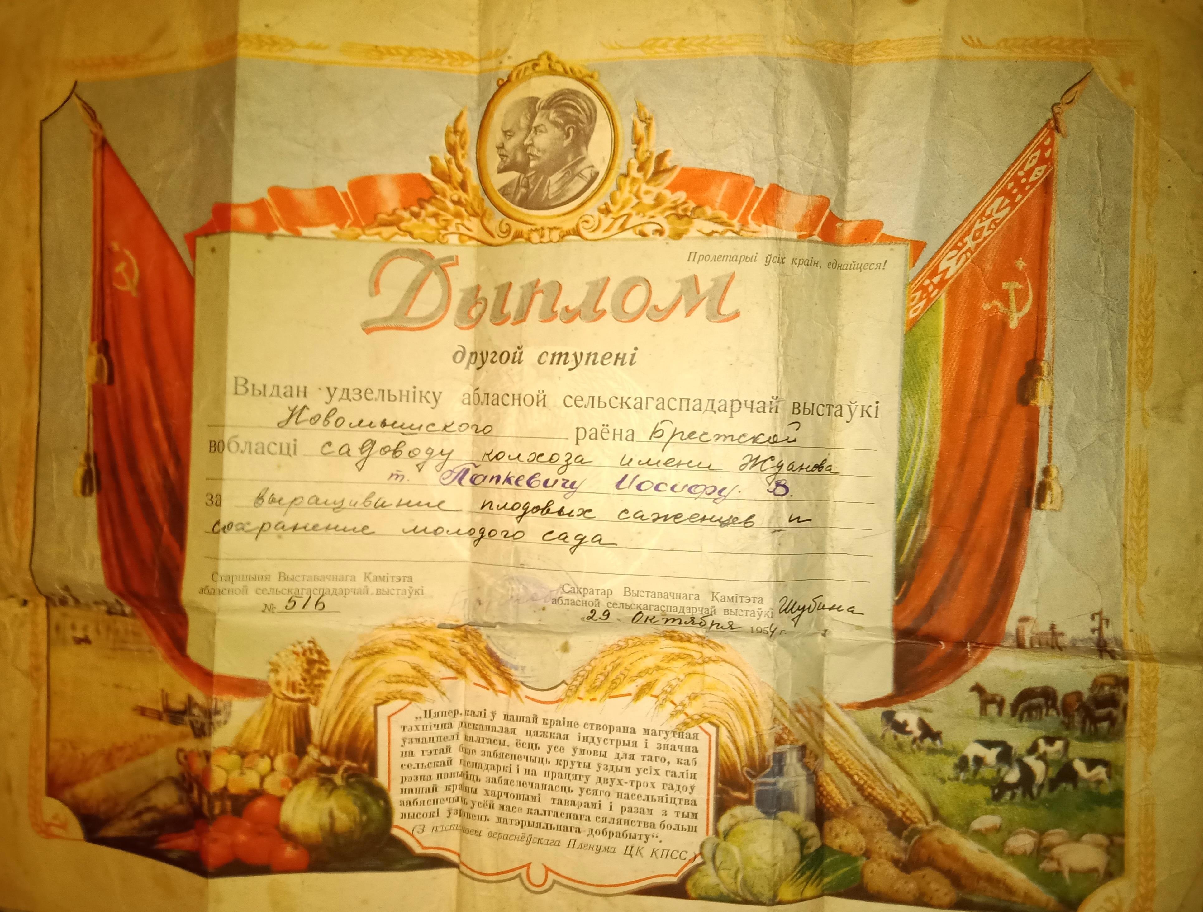 Первый - диплом второй степени моего деда, выданный на областной сельскохозяйственной выставке, за выращивание плодовых саженцев и сохранение молодого сада.