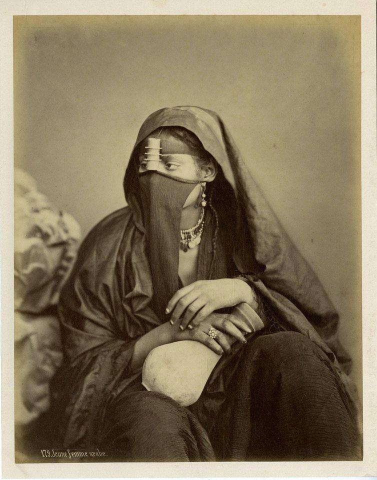 Для иллюстрации фото конца XIX столетия. Юная девица из Каира, столицы арабского Востока и на протяжении многих веков главного центра арабского исламского богословия. Как хорошо видим, тут намордник вообще ничего не скрывает, а только подчёркивает декольте и всё прочее…