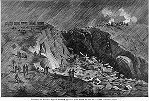Произошло это в 1882 году в ночь с 29 на 30 июня. В те дни шел непрекращающийся дождь, сопровождаемый грозой. С неба выпало столько влаги, что просто начало размывать искусственную насыпь, по которой проходило полотно железной дороги в сторону станции Кукуево. Водопропускные трубы были слишком маленького диаметра и не справлялись с таким большим напором воды. Рельсы просто повисли в воздухе.