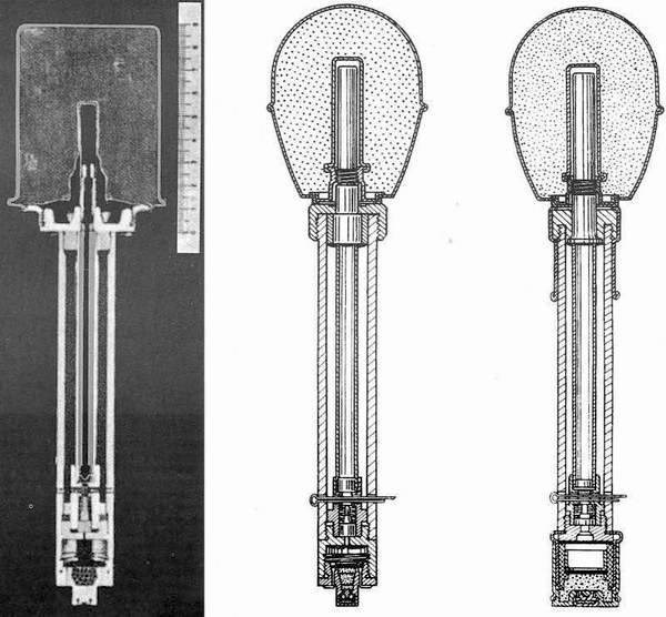 Оружие понравилось и получило развитие. Был разработан даже специальный вариант для борьбы с бронетехникой. Это была кумулятивная граната, которую называли Panzergranatpatronen (правая на картинке). Осколочная граната соответственно Sprengpatronen. Вот как они выглядели «изнутри»:
