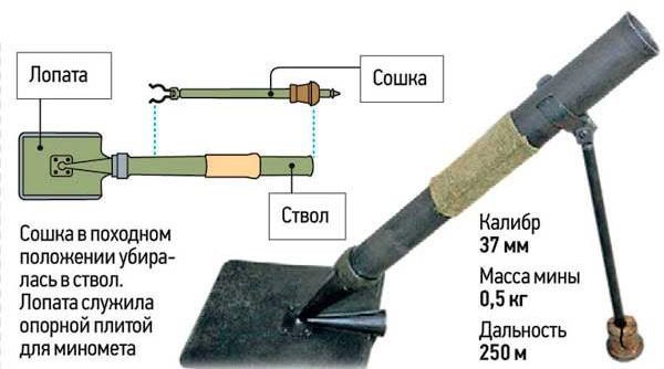 Для справедливости нужно заметить, что уже в наше время эта идея была ещё раз использована, но теперь лопата стреляет не минами, а стандартными гранатами калибра 40 мм, но "это уже совсем другая история".