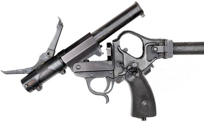 Не было бы возможно ничего, но в 1943 году техник-лейтенант Геннадий Петрович Баранов получил ранение, и чтобы не терять зря времени на больничной койке, он взялся за разработку нового оружия. Есть версия, что к этой идее подтолкнул образец немецкого «штурмового пистолета», который как-то попал к технику-лейтенанту Баранову, но я в этом сильно сомневаюсь. Дело в том, что товарищ Баранов проходил свою службу на аэродроме морской авиации и к окопным сражениям отношения не имел. Зато он по службе был отлично знаком с ракетницами, которые в Красной армии выглядели ничуть не менее грозно, чем у немцев. И уж точно были не менее крепкими и надёжными. Вот это та самая ракетница ОСП-30:
