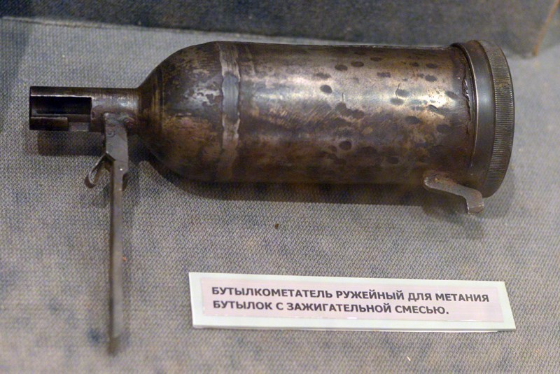 Были и другие достаточно необычные виды оружия в Красной Армии. Распространённые и не очень. Например все знают про бутылки с зажигательной смесью, но мало людей слышало про "бутылкометатели". С помощью такого образца оружия конструкции замечательного советского конструктора Ивана Петровича Иночкина (например) бутылку можно было запустить на расстояние до 100 метров (!). Их делали в Сталинграде на заводе "Баррикады" (том самом!). Вот эта насадка: