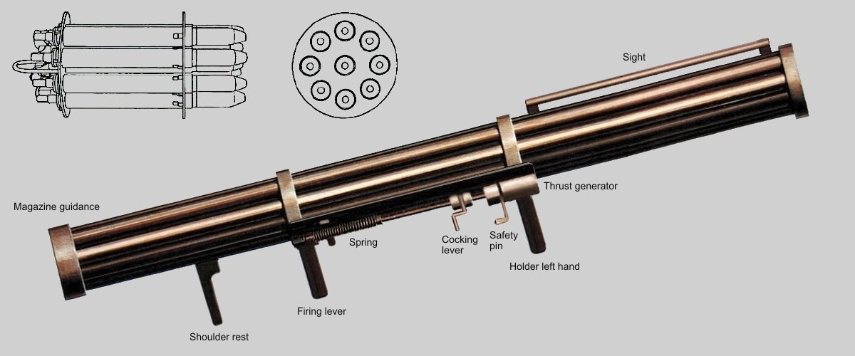 Гранатомёт состоял из 9 стволов калибра 20 мм. Пуск осуществлялся двумя залпами по 5 и 4 выстрела в каждом с помощью электровоспламенителей. Заряжался он готовыми кассетами. Разумеется сбить самолёт из такой штуки было непросто, но для заградительного огня вполне неплохое оружие, особенно с учётом его максимальной дальности стрельбы - целых 450 метров.