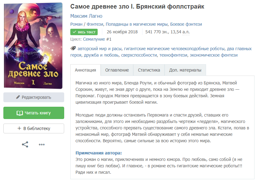 Кстати, первую книгу тоже подредактировал и укрупнил, добавив описаний, на которые я был скуп в годы написания. Сменил название и добавил циферки (нет, не те, которые называются "проклятыми логами и статами"), теперь это официально серия )) Думаю ещё переписать аннотацию, ибо сейчас она постыдная.