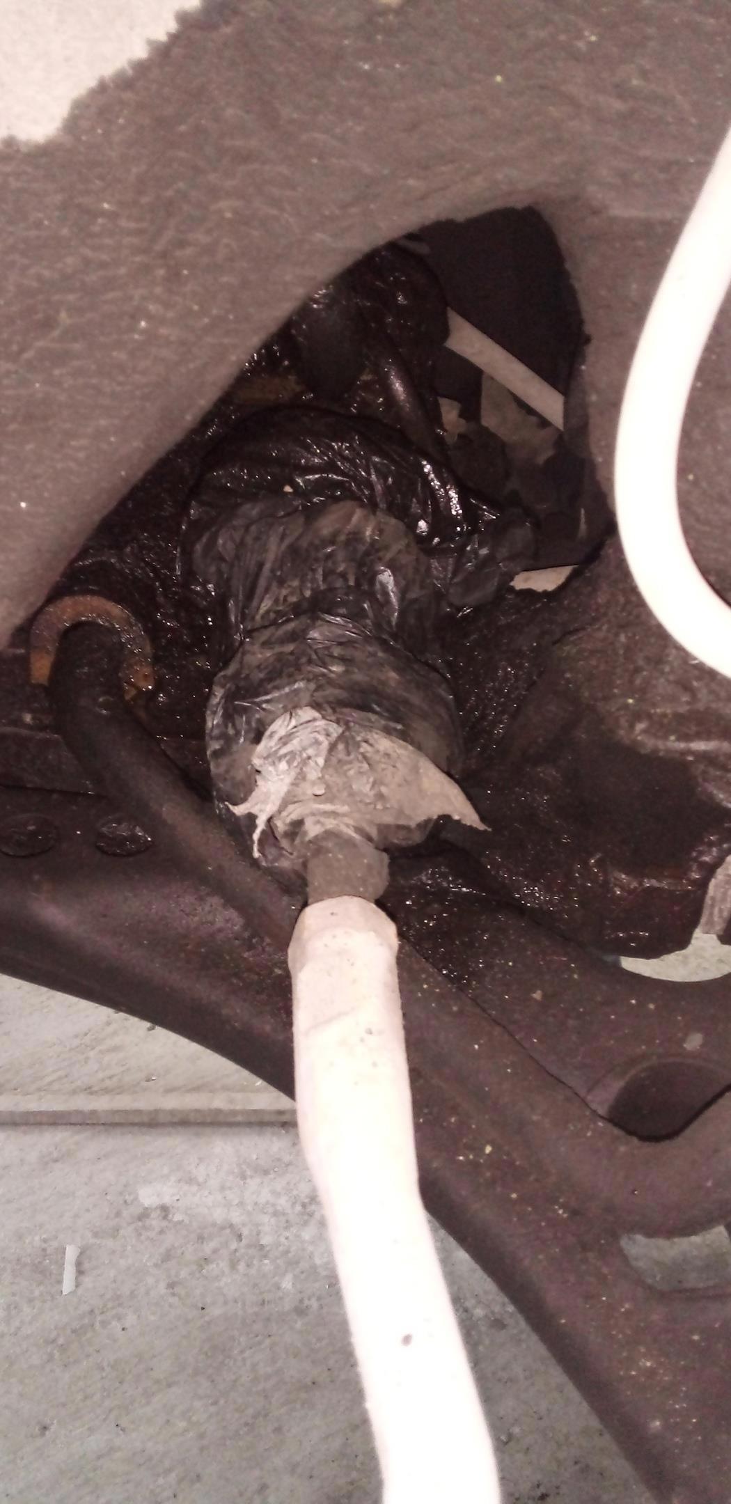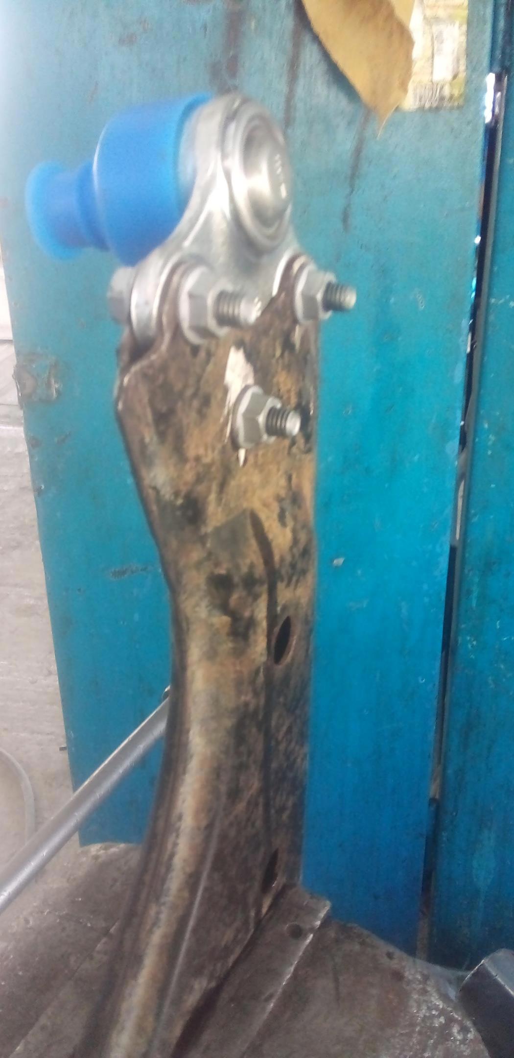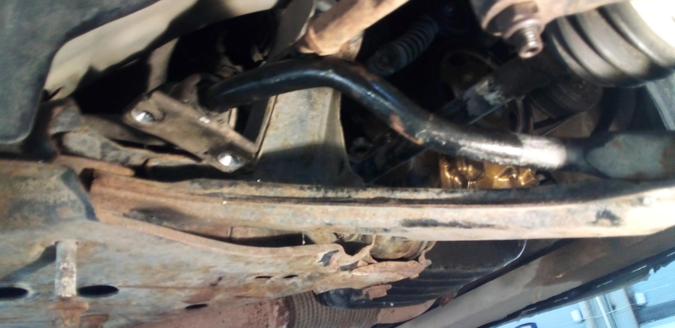 Там ещё прикол, что надо открутить передний болт рычага, который стягивает сайлентблок и ограничивает поворот рычага, из-за чего ступицу прикрутить к стойке проблематично, ибо её тащит рычагом вверх. Открутил рычаг, собрал, потом поставил автобус на колёса и протянул рычаг. Просверлил новые дырки, все подогнал и собрал стойку. Пришло время стаба. Стойка уже была снята при разборке. И тут меня ждало очередное открытие.
