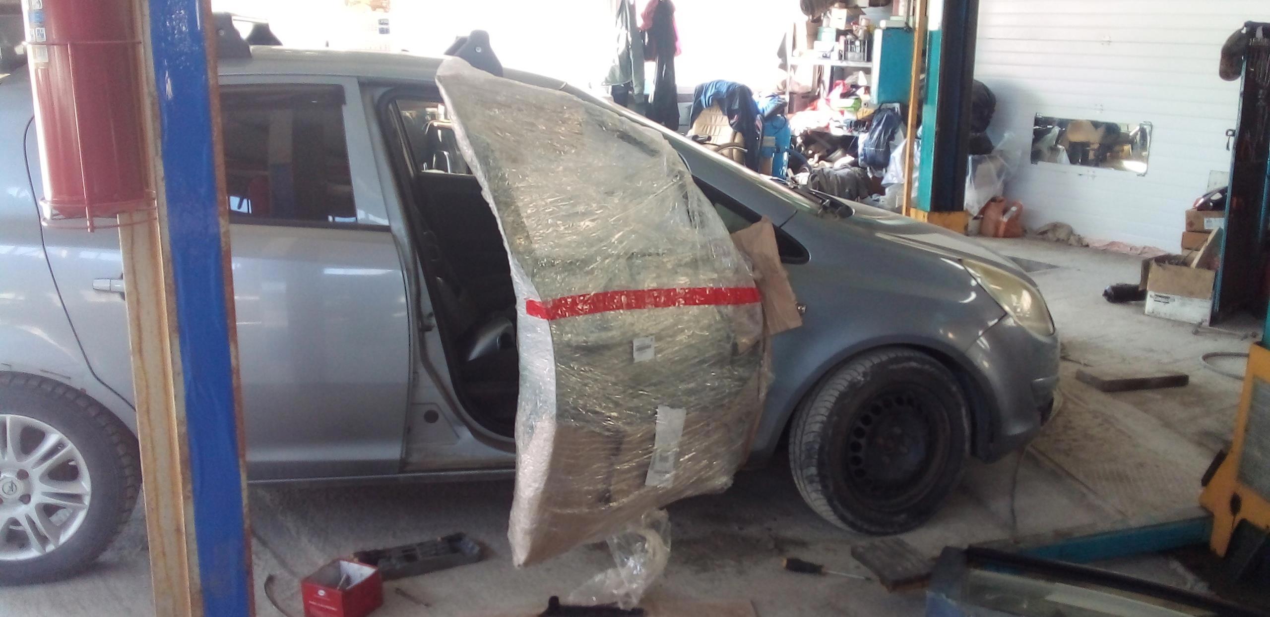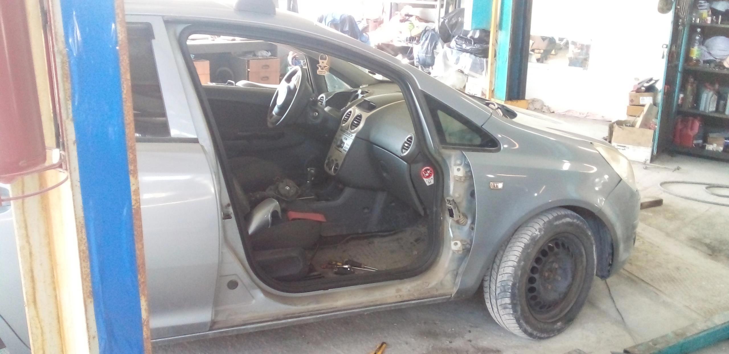Мне же выпало заниматься убогим Опелем, на котором коллега менял мотор. В этот раз надо было заменить правое переднее крыло и правую переднюю дверь, + перебрать его по подвеске спереди немного. Машина была в аварии, ручка двери снаружи сломана, снутри - тоже сломана. Дверь не открывается. Но это не беда, если есть балгарка!