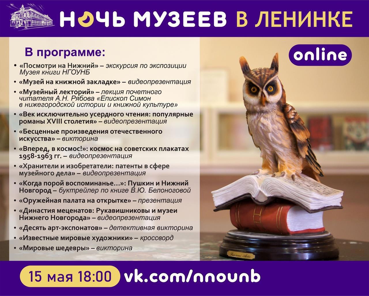 С шести часов вечера и до полуночи в группе Нижегородской областной библиотеки ВКонтакте вас ждут увлекательные викторины и лекции, презентации и буктрейлеры, и, конечно же, экскурсия по новой экспозиции Музея книги Нижегородской «Ленинки»!