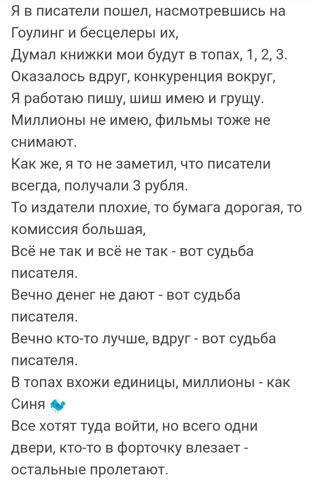 Но самое смешное, что авторы очень плохо принимают чужое творчество, авторы которые, что-то читают единицы - и реально видно, насколь от этого их произведения лучше на фоне тругих.