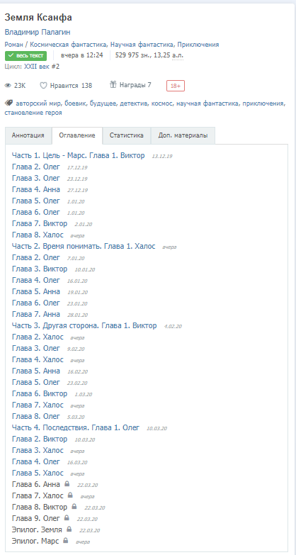 4. Подправил теги: авторский мир, альтернатива, будущее, детектив, киберпанк, космос, научная фантастика, постап, становление героя.