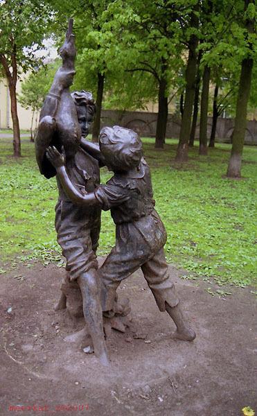 Самое удивительное – эта скульптурная группа и сейчас там стоит! Говорят, она была отлита еще в 19-м веке, на заводе Сент-Галлен. В 2005-м году ее реставрировали и поставили на небольшой пьедестал (фотография сделана еще до реставрации). Но и без него, когда в детстве я стоял рядом с этими чугунными мальчишками, они казались мне великанами!