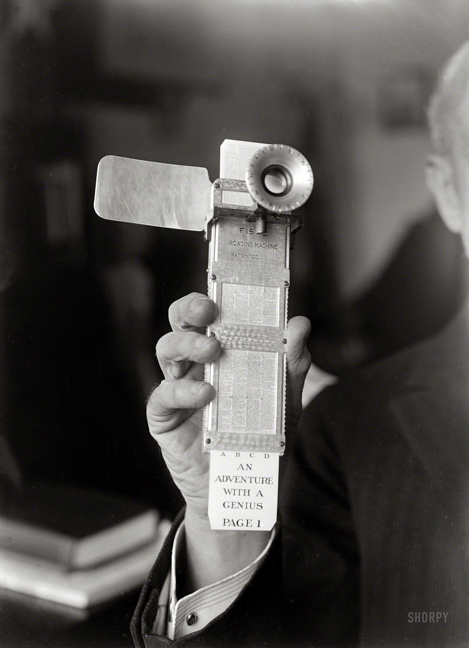 Отставным контр-адмиралом Брэдли А. Фиске была изобретена «Читающая машина», которая складывается в размер авторучки. Она предназначена для того, чтобы покончить с громоздкими книгами — сообщает сегодня газета «Геральд Трибюн».