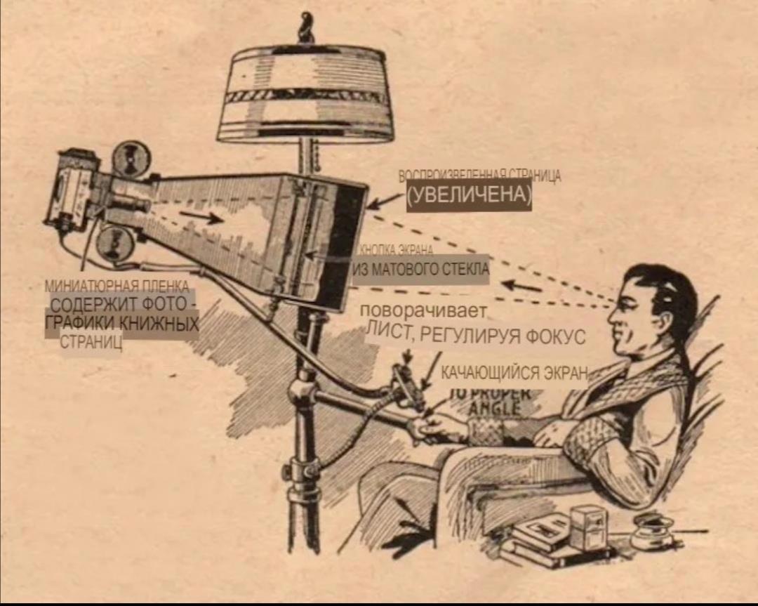 Полагая, что в ближайшие годы все книги будут храниться на микрофильмах, журнал опубликовал изображение того, что можно было бы условно назвать эквивалентом современного планшета. Аппарат со стеклянным экраном, кнопками для переворачивания страниц и регулировкой угла экрана.