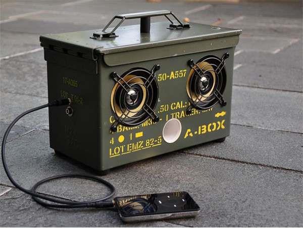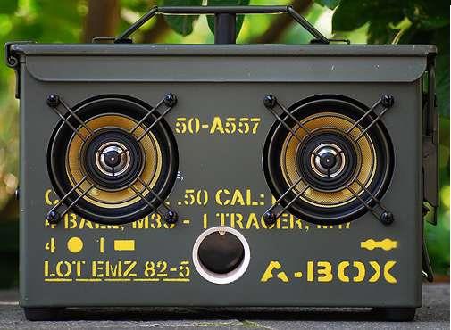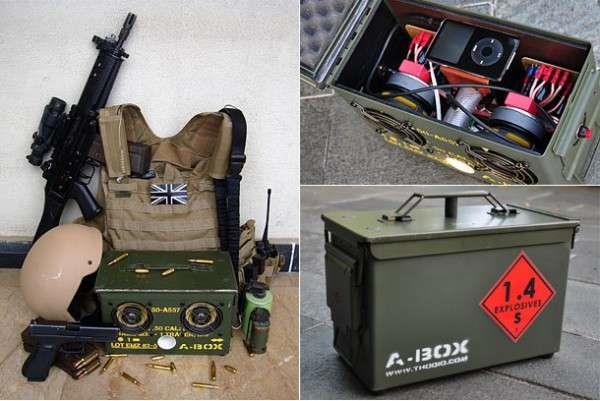 Переделанная коробка от боеприпасов 1950-х годов с возможностью подключения к iPod. Внешняя поверхность из стальной пластины толщиной 1 мм, которая дополнительно укреплена 6-миллиметровой треспой.
