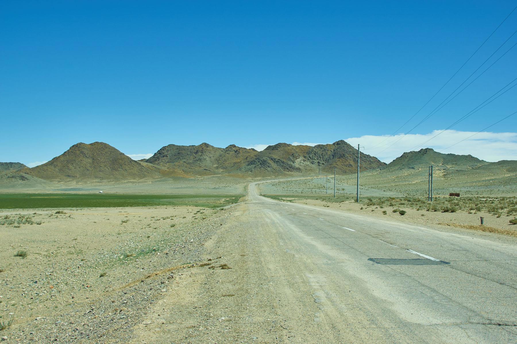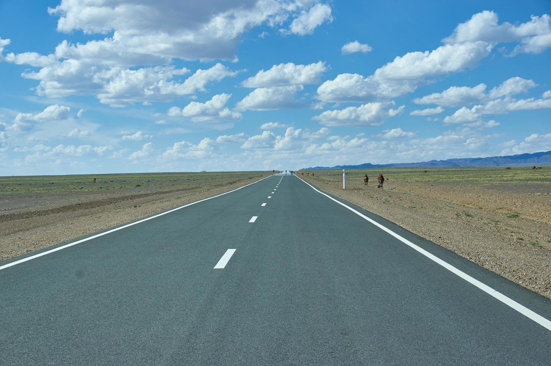 Здесь, вообще, хайвей! Спасибо китайцам. Впереди заметен мираж, вокруг пустыня и жарко. Но слишком разгоняться не следует - верблюды чувствуют себя здесь настоящими хозяевами. Или можно подкатиться к упавшему после паводку мосту или земля ушла вниз. Всякое бывает.