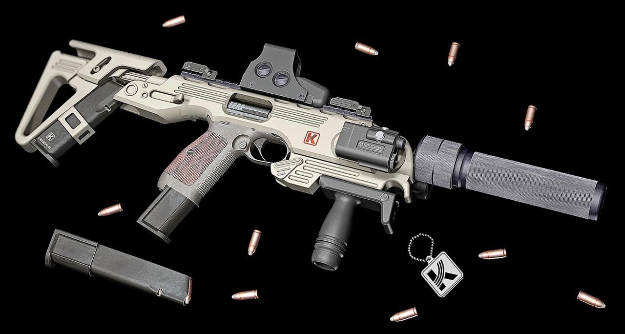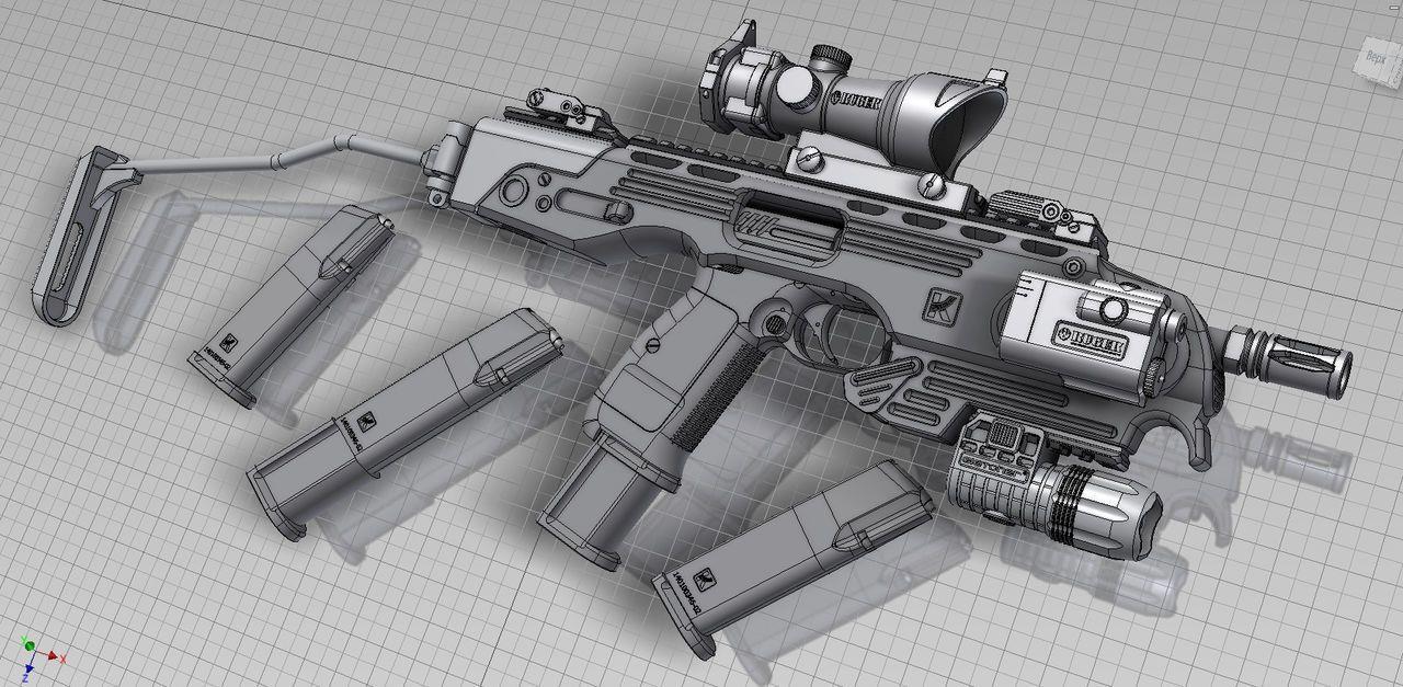 И всем, между прочим, было понятно, что глушители, прицелы, фонарики, лазеры, длинные магазины... всё это вес добавляет. Такую тяжесть таскать? Этак и надорваться недолго. Понятно было, что нужен приклад. Но ведь, с другой-то стороны, если есть приклад, то целиться удобнее и можно подальше стрельнуть при случае. Собрались конструктора и придумали специальную приблуду к нашему пистолету с откидным прикладом. Уже и сами загорелись идеей слегка. Задумались – а что ещё к нему такого можно приделать, чтобы на международной оружейной толкучке не стыдно было на люди показаться? А давай прицел поставим... такой прицел... не абы какой, а чтобы уже хороший прицел. Сказано – отрендэрино: