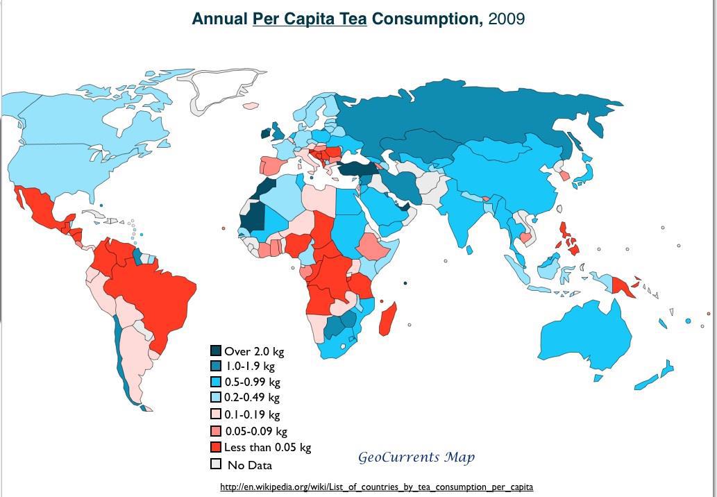 А вот Россия медленно дрейфует из статуса чайной страны к статусу кофейной. Ещё интересно отметить, что в таких признанных чайных странах, как Китай и государства Средней Азии, выпивают чая не так уж и много, если сравнивать с первой шестёркой лидеров.