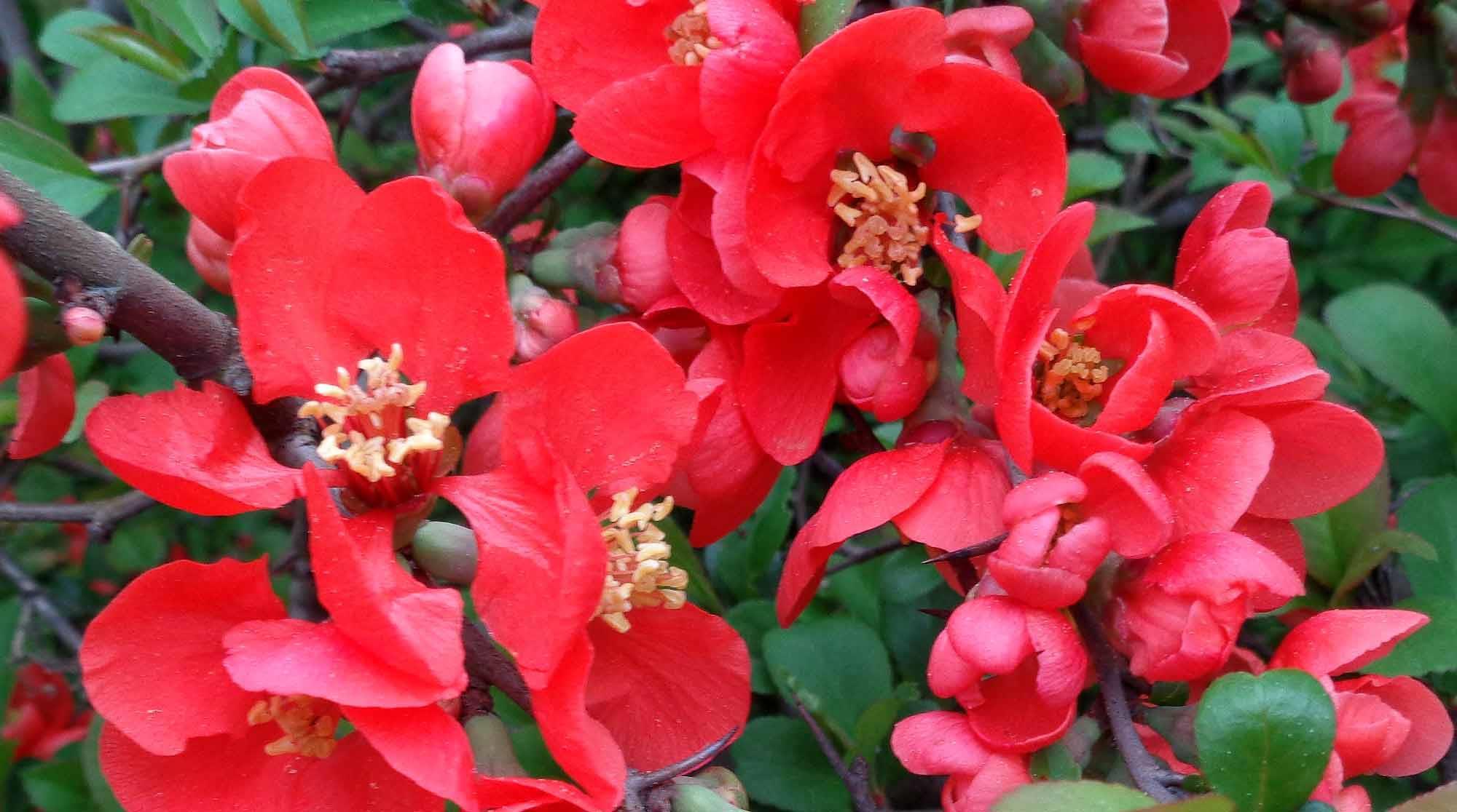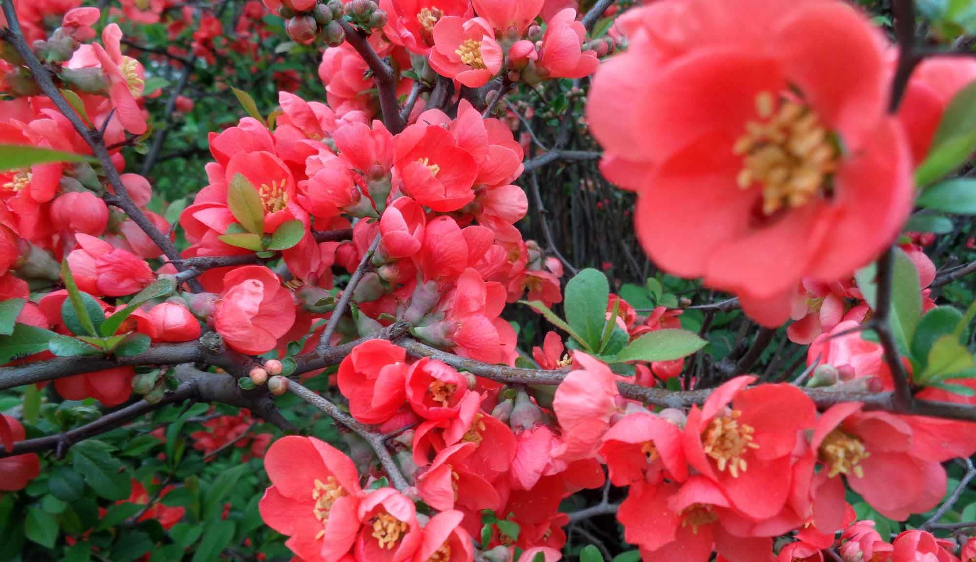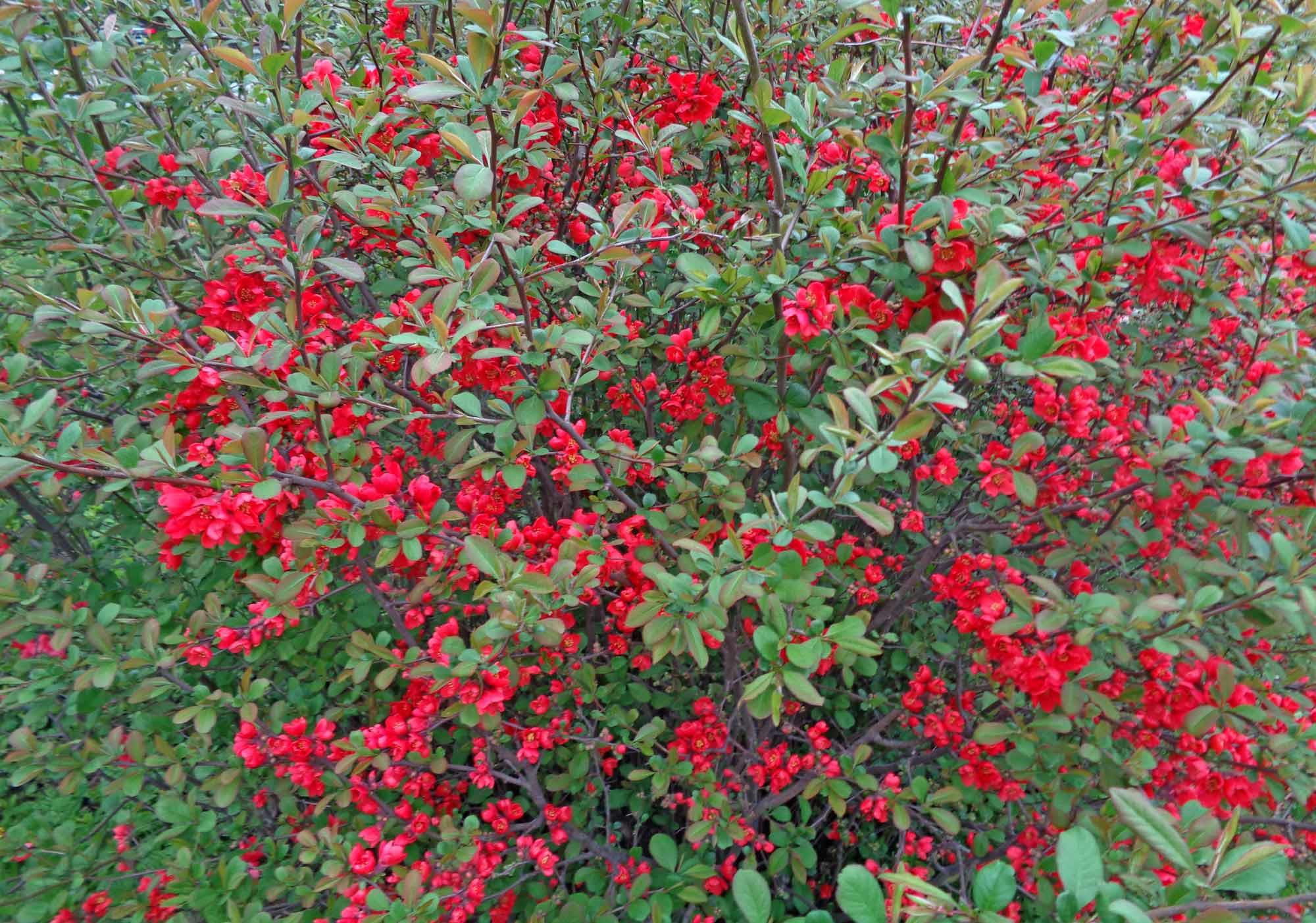 Камелия гибридная, общий вид кустарника. Нам издали показалось, что это ягоды. Но весна ягод не подразумевает: