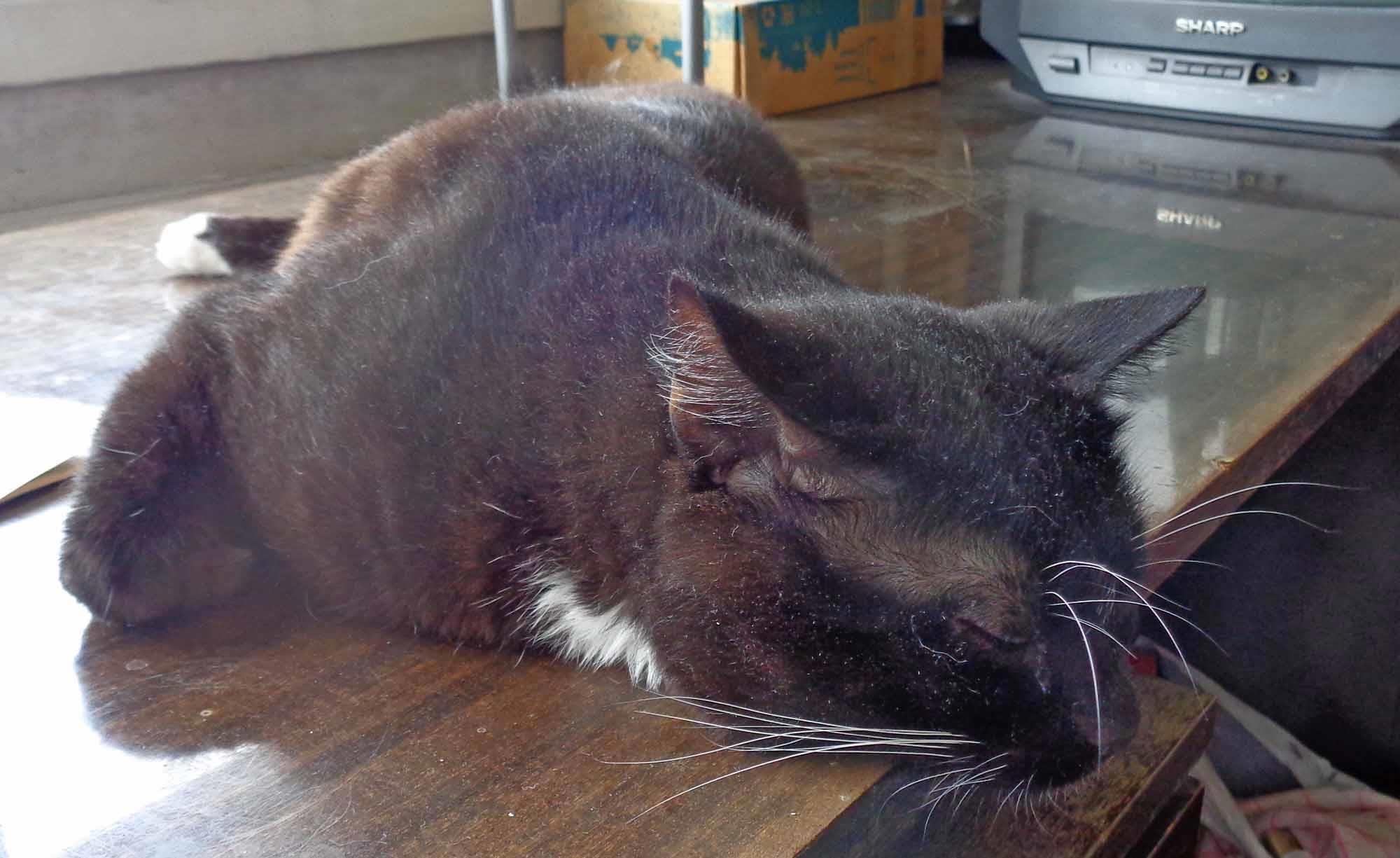 А кошачка разморило от жары и он распластался на письменном столе в полном изнеможении: