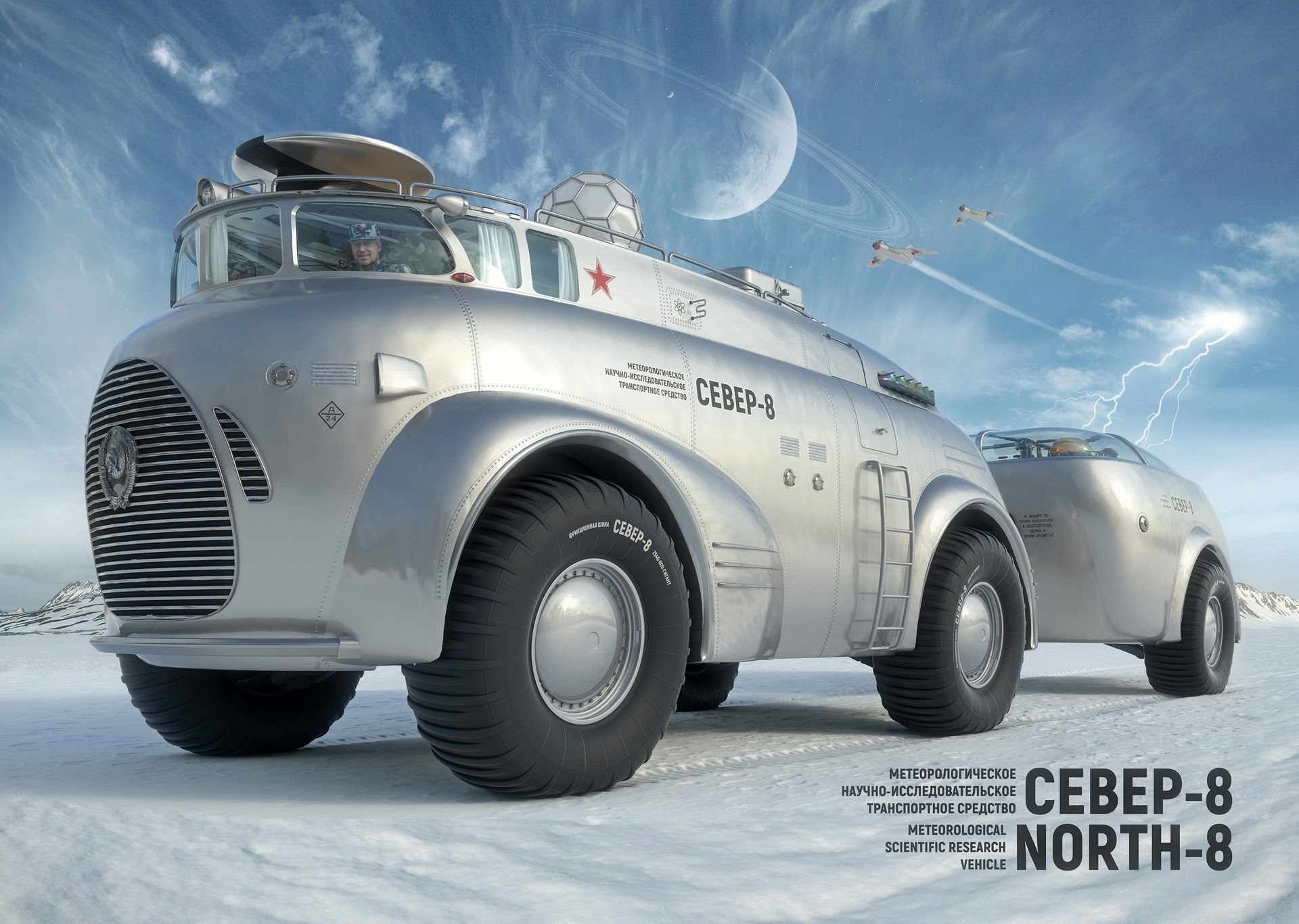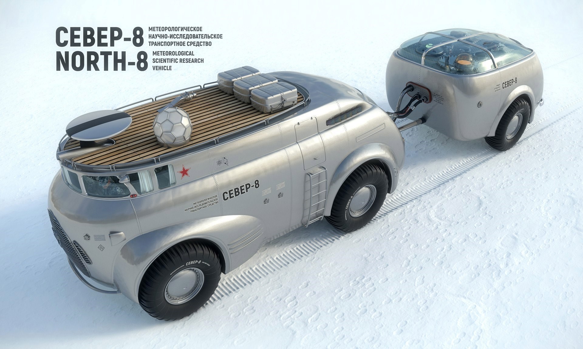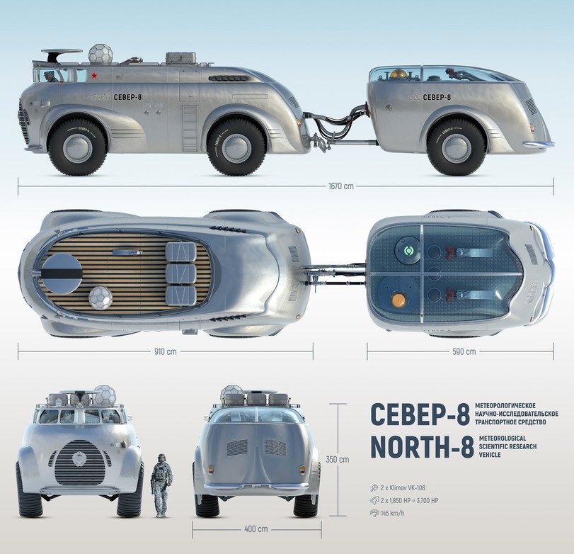 Автор: Евгений КрасРомантичное время эти пятидесятые годы всё-таки, конечно, если отвлечься от войн "обычных" и угрозы с минуту на минуту появления войны ядерной. Конструктора, учёные, промышленность ещё не остыли после закончившейся глобальной войны и по инерции продолжали гонку идей. В этой гонке было много ошибок, много соревновательного, но то, что проходило немилосердное "сито" было просто отличным. Хотя и то, что "сито" не проходило не всегда было совсем плохим и негодным. СССР рвался в космос, попутно крепя оборону. Ну а в нашей стране крепить оборону, не обращая внимания на Север, просто не имеет смысла. Поэтому не только сейчас, но и в те времена на Севере много чего испытывалось и много чего происходило. Сейчас благодаря энтузиазму некоторых людей информация о некоторых идеях, не прошедших конкурс истории, всплывает на всеобщее обозрение и часто заставляет без всяких кавычек восхищаться своеобразной эстетикой того времени. Казалось бы, что может быть романтичного в вездеходе для южного берега Северного Ледовитого океана, но ведь может! Экипаж 3 чел., скорость по шоссе - 145 км/час, по бездорожью - до 80 км/час, мощность газотурбинного двигателя - 3700 л.с., построен в количестве 3 экземпляра. Это 1953 год. Посмотрите на него: