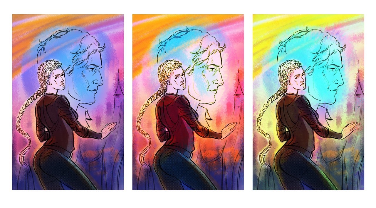 ![]() | была просьба нарисить хорошо видимую девочку. Вот сначала получилась такая героика (первая) потом возник вариан сделать ее чуть более сомневающейся (вторая) На основании сомневающейся Анастасия предложила три цветовых варианта. Я выбрала средний | ![]() |