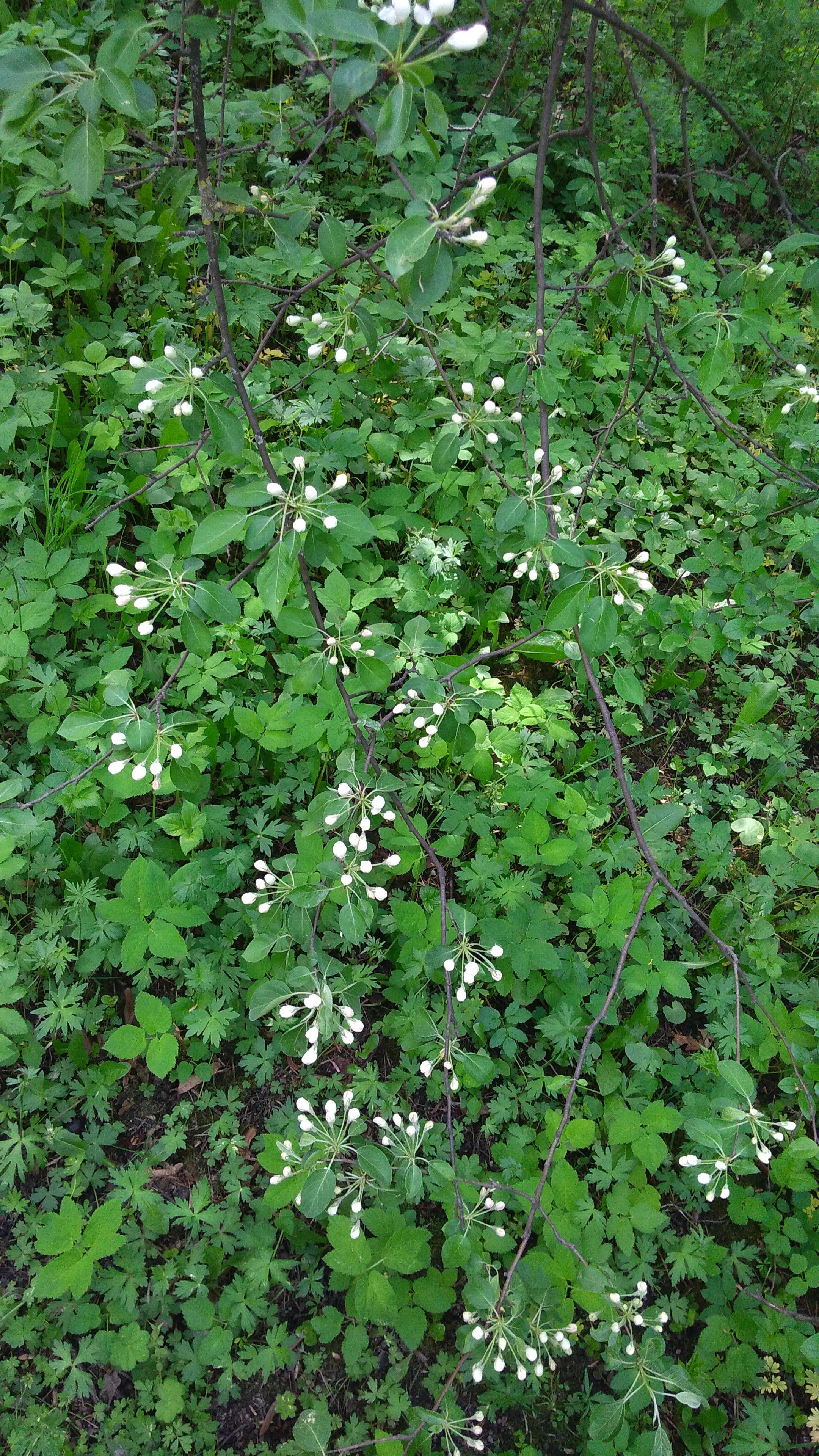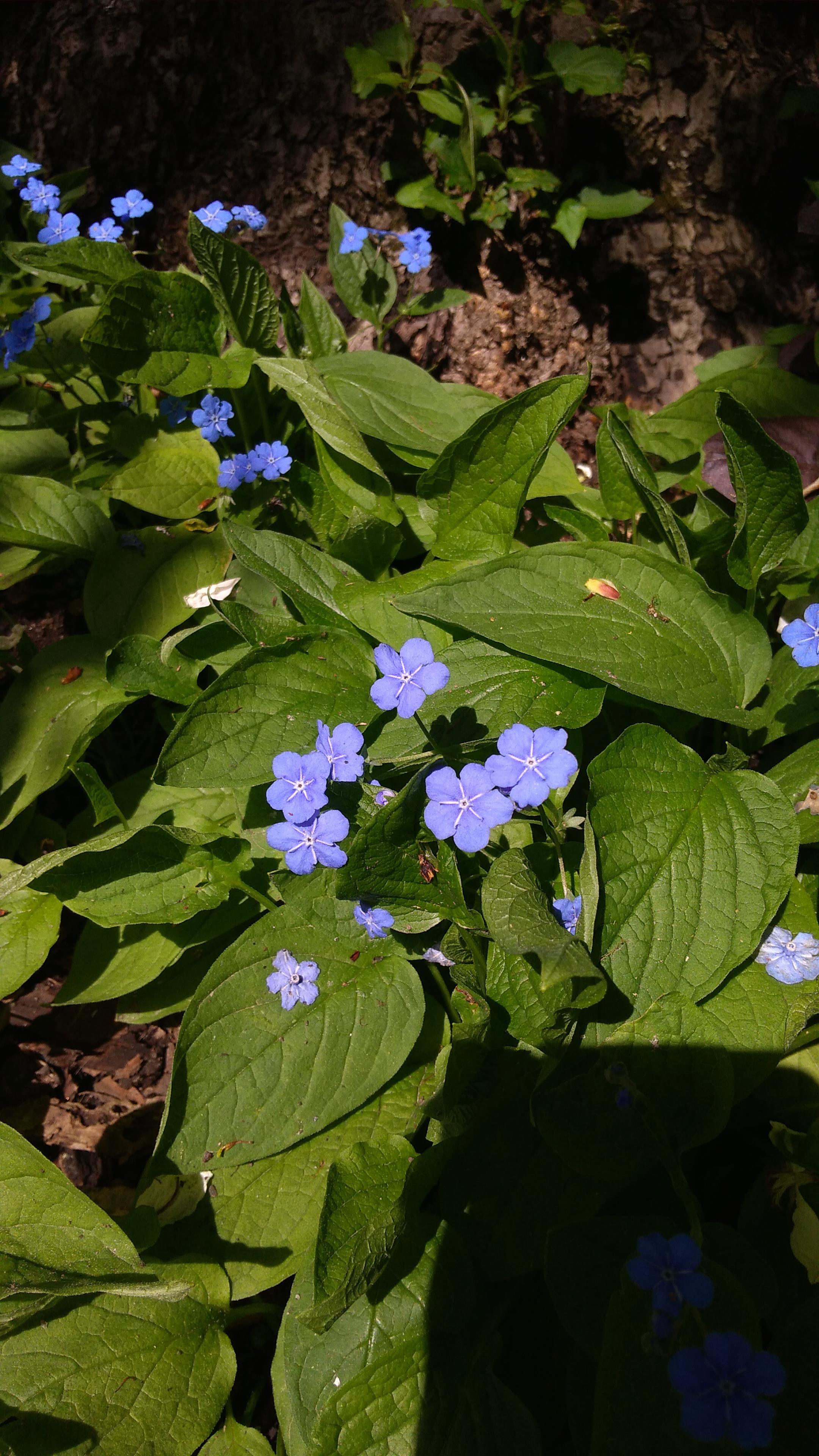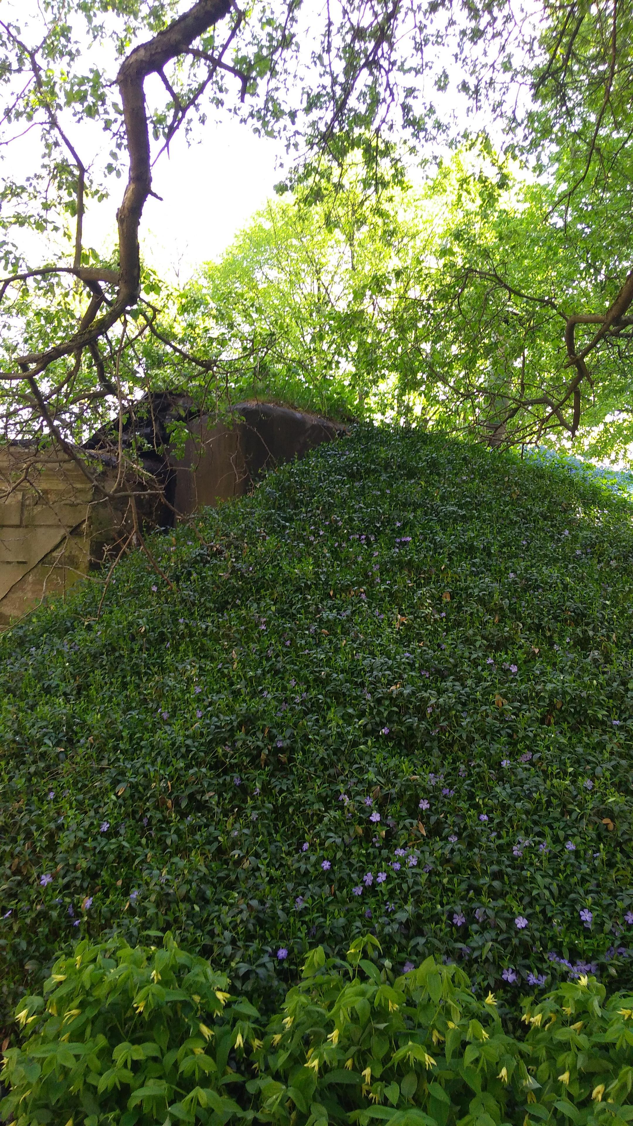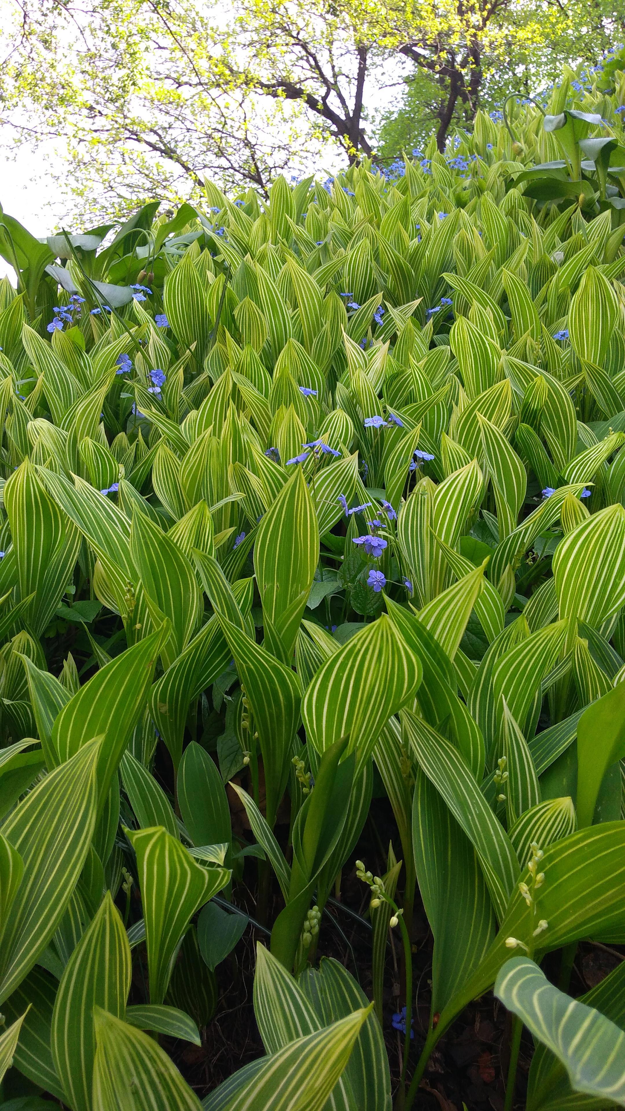 Ландышевый склон с другой теневой стороны увит барвинком. Компанию составляет лист рябины серебристой.