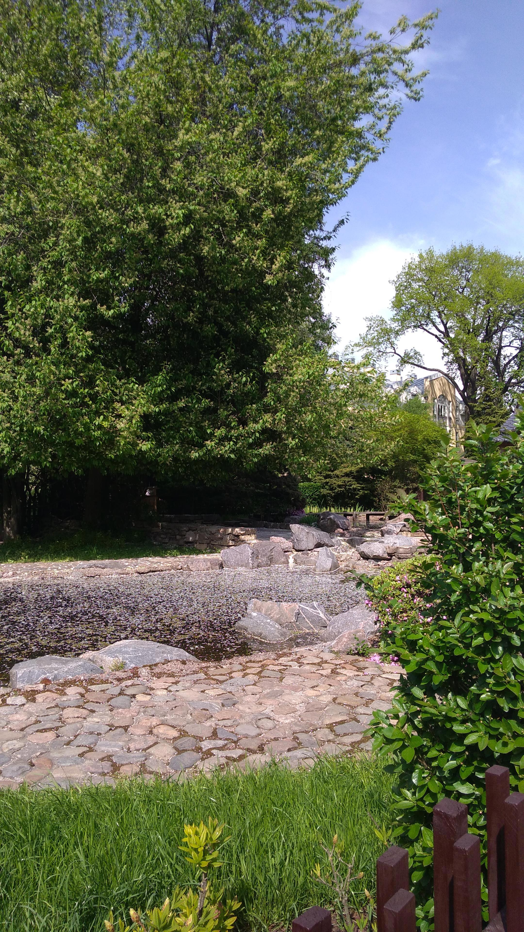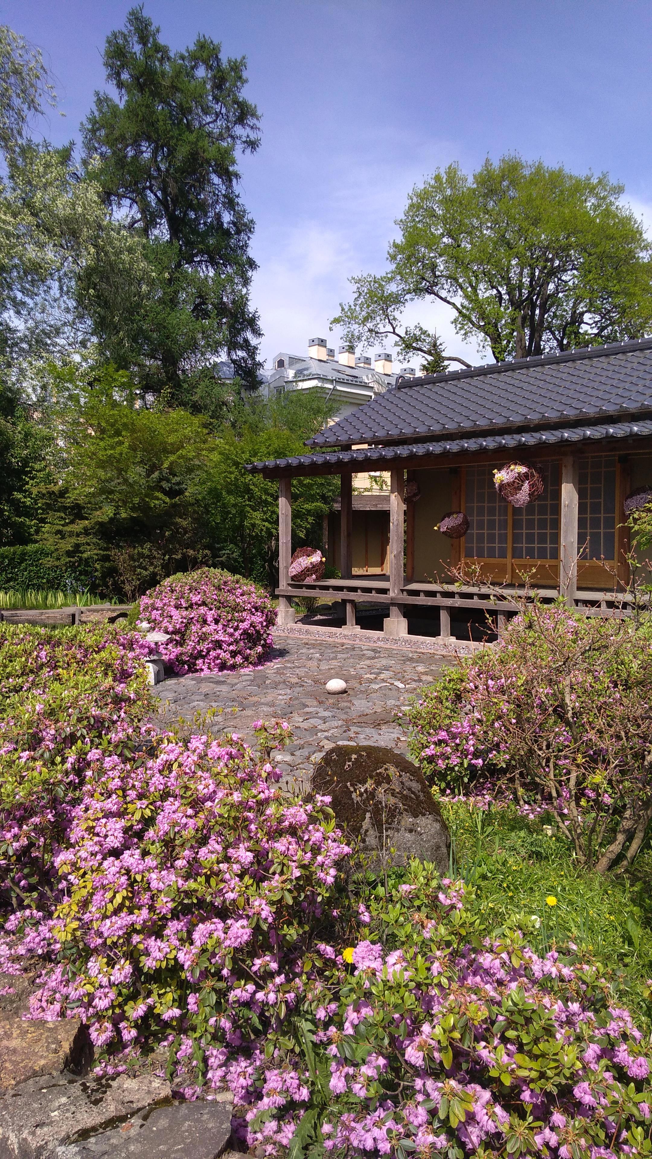 Который уже год облизываюсь на него из-за оградки и фоткаю издалека, потому как экскурсии проводят нечасто, а ехать их отлавливать специально пока не дозрела. Розово-белый склон, усеянный лепестками пруд, ясное небо - чем не уголок Японии в центре Петербурга?