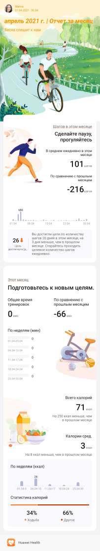 Поэтому я снова начала тихо ползать по квартире до кухни и туалета. И за апрель Хуавей прислал мне отчет, что я достигла дна цели за 26 дней, примерно 100 шагов в день наползалось, хотя в счет шло и то, что в постели телефон перекладывался слева направо, так что реально и того меньше. Но отчет очень красивый, там видно как как бы я как бы еду на велосипеде в погоне за парнем)) особенно интригует статистика калорий - 34% ходьбы и 66% другого, а я точно знаю "другого" у меня в апреле не было и в этом году не было и в том) Интересно какая в мае будет статистика) мне понравилась программка, мотивирующая такая.