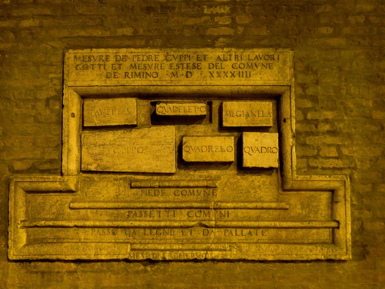 В Римини неплохо сохранился средневековый центр города. И там в открытом портике Palazzo del Podestà, дворца, где жил и работал выборный глава местной администрации, на внутренней стене можно увидеть измерительные эталоны.