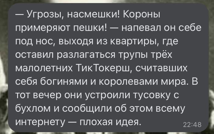 Суть в том, что сейчас, когда мания величия и завышенная самооценка вроде бы в моде среди тех, кто пользуется небезызвестной соцсетью ТикТок, ставшей символом этого самого Зомби-Поколения, из меня вырвалась парочка строк. Родились они, когда я встретил мадаму, снимавшую видео под песню группы Король и Шут «Марионетки». Так вот и суть в том, что она абсолютно не понимала смысл... мне хотелось свернуть ей шею.