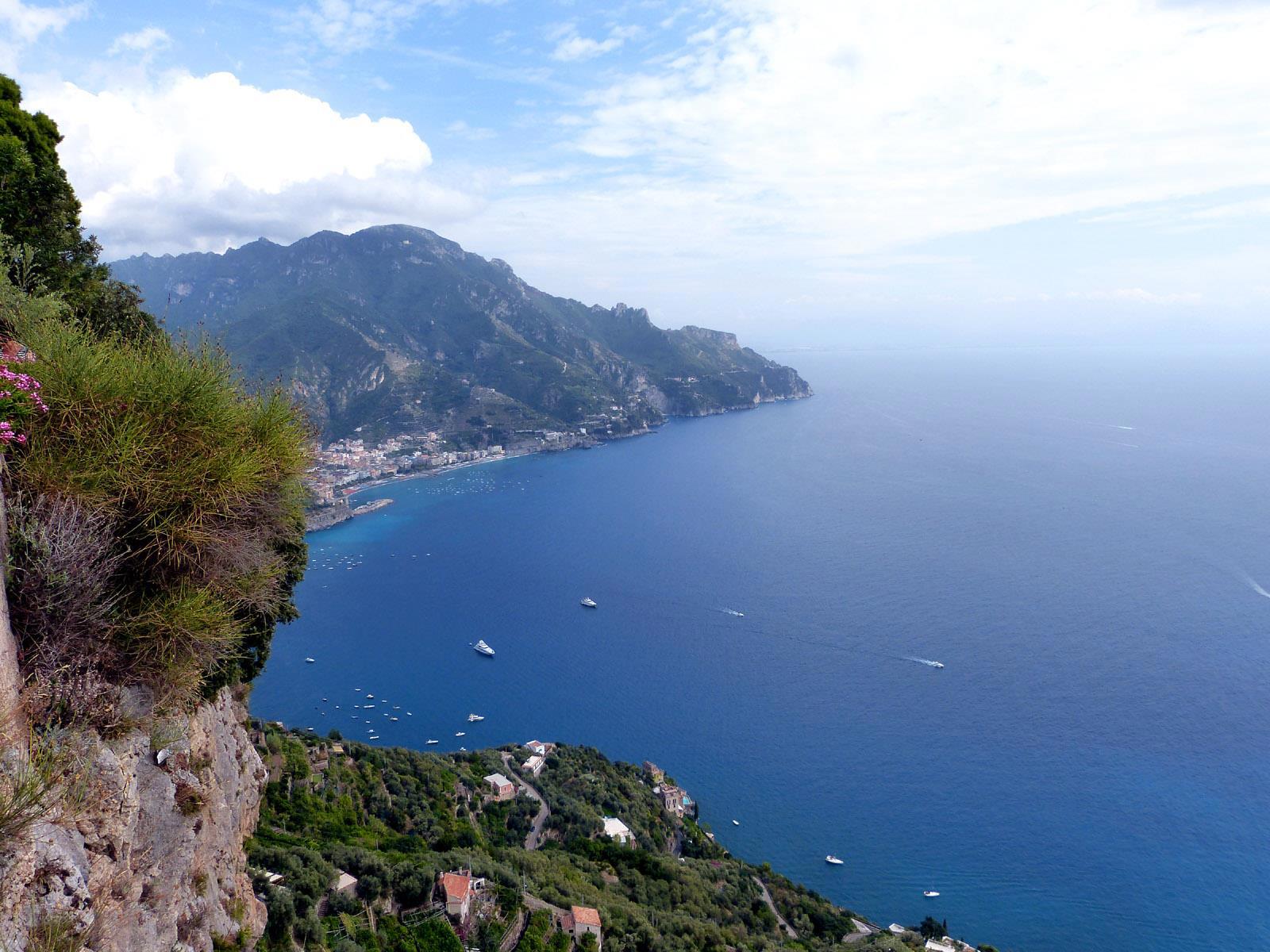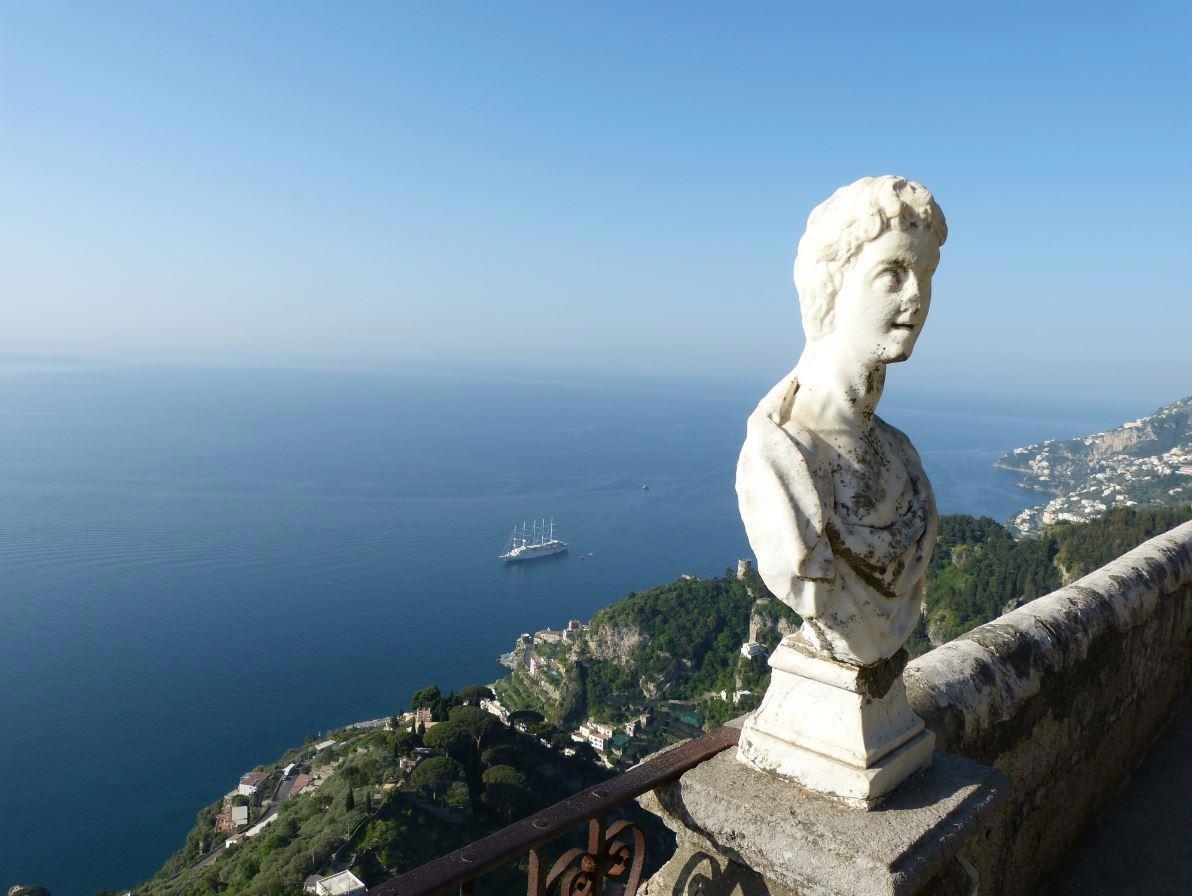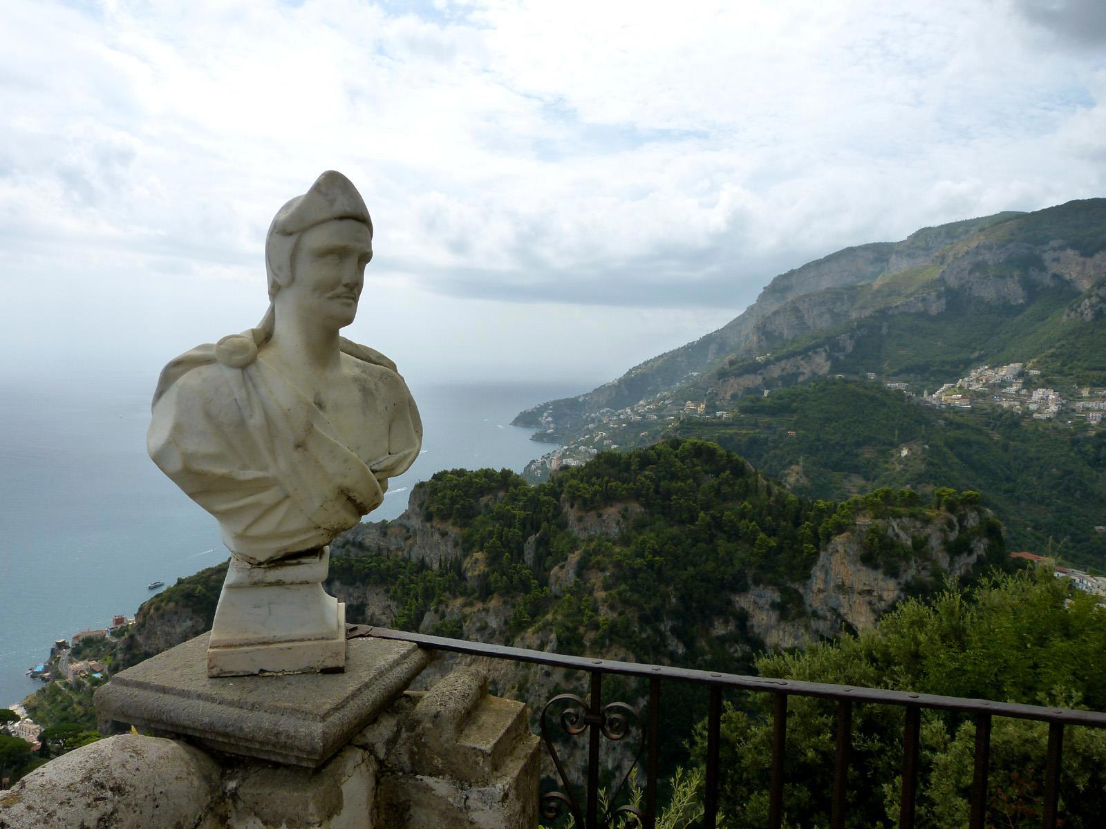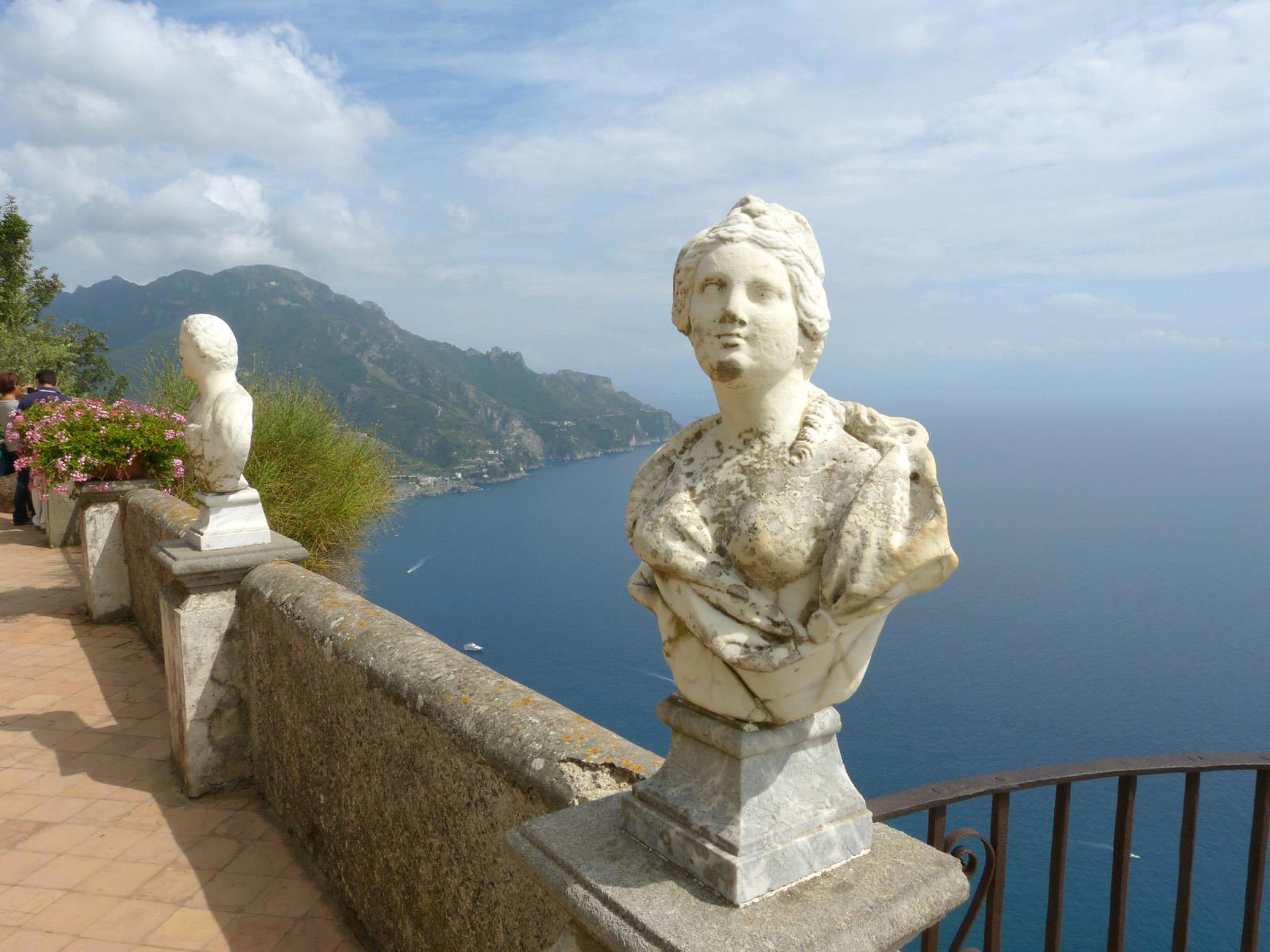 Равелло — это очень живописное местечко. Оно расположено на вершине утёса, отвесно поднимающегося над местным побережьем. Этот утёс выше соседних скал и склонов метров на сто, а то и двести, поэтому в Равелло много замечательных видовых площадок, на многих из которых сейчас стоят красивые виллы.