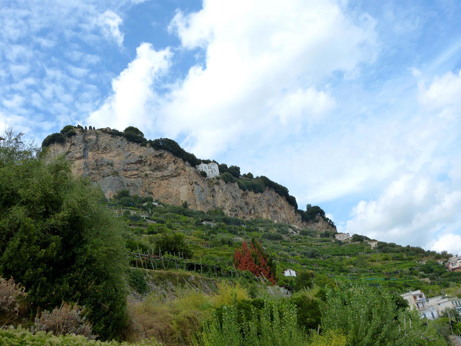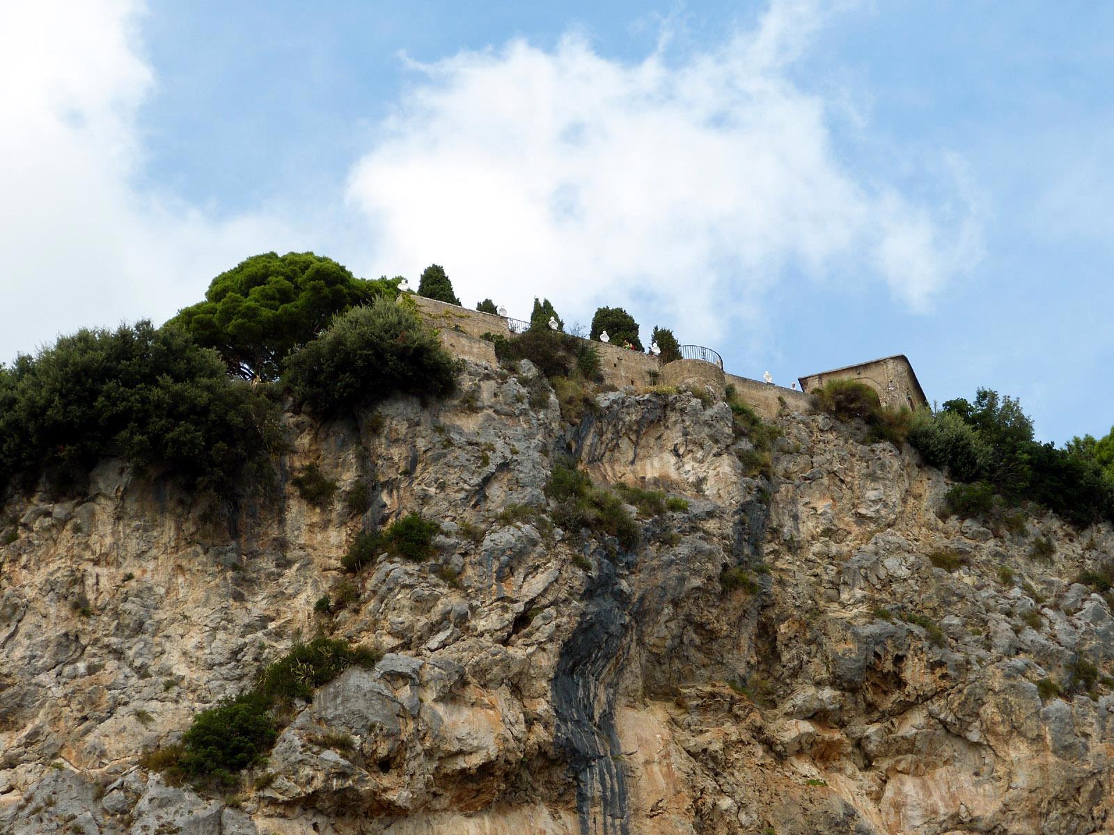 Мы как-то спускались со скалы, на которой стоит Равелло, и имели возможность полюбоваться бельведором виллы Чимброне снизу. Терраса бесконечности действительно стоит на самом краешке!