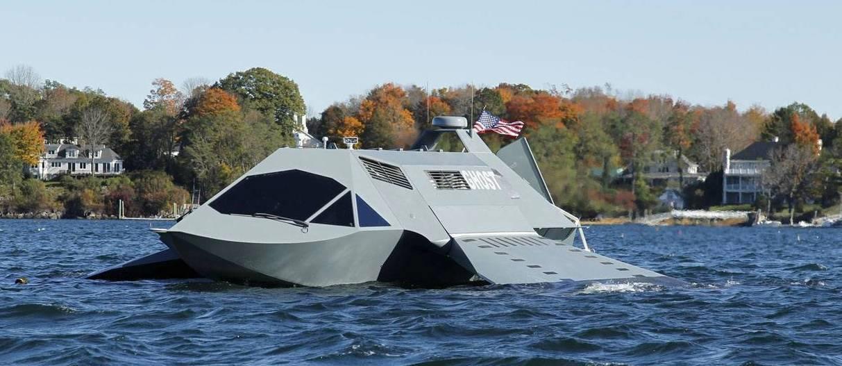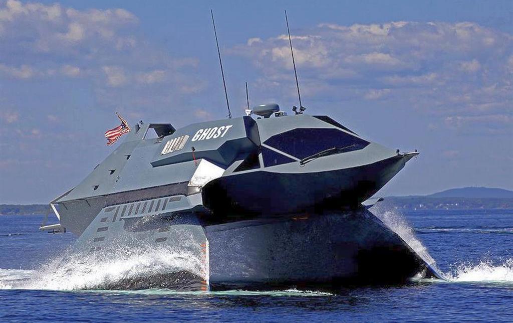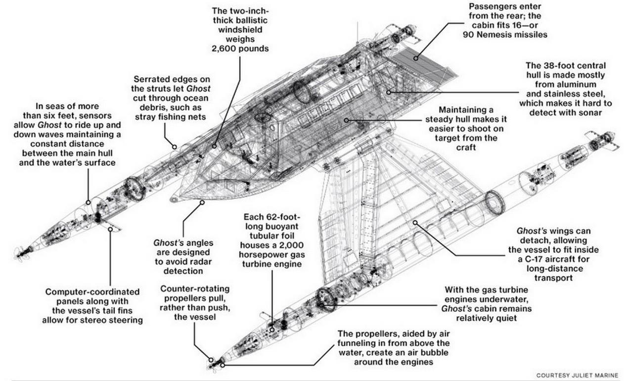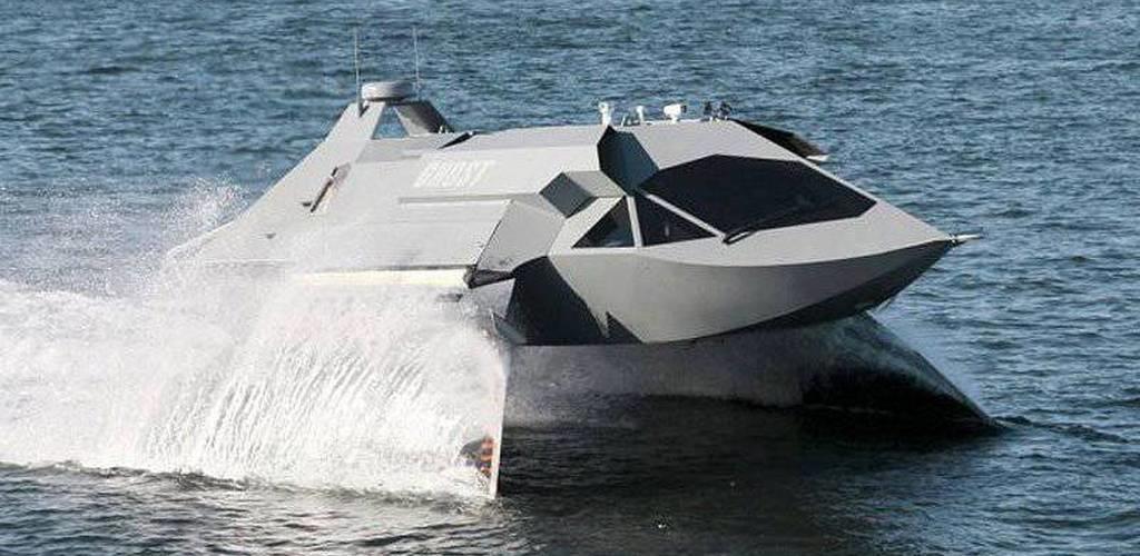 Итак, название катера «Ghost», что только звучит, как русское слово «гость», но переводится на самом деле как «Призрак», «Привидение» или что-то типа того. Идея такова, что катер должен бороться с пиратами, контрабандистами, русскими подводными лодками на мелководье и вообще иметь «неоспоримое преимущество». Для этого он должен обладать высокими скоростными и манёвренными качествами. Характеристики поначалу держали в секрете, но говорят, что на катере они просто запредельные, потому как там используется «технология суперкавитации». Ну, в целом понятно – с невидимостью они уже поиграли. Надоело. Теперь будем играть с «суперкавитацией». Хотя и про «невидимость» тоже не забыли. Посмотрите на внешний вид этого катера: