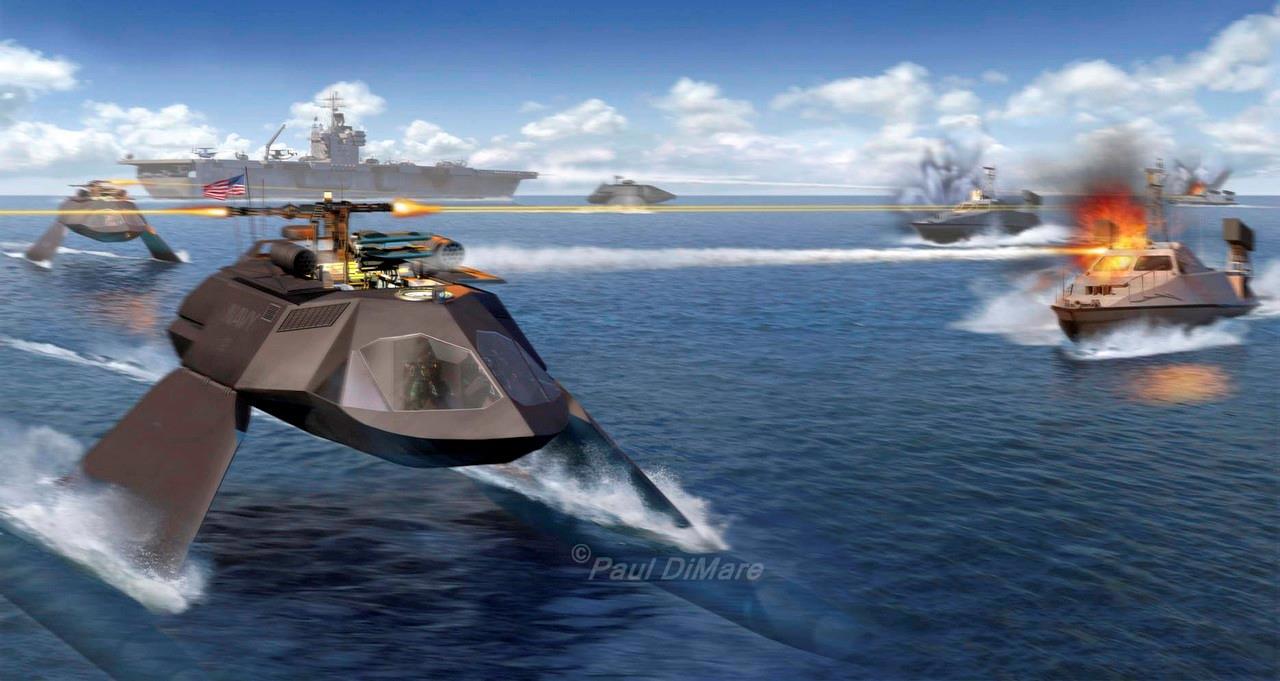 Теперь хорошо видно, что «крылья» стоят более вертикально. То есть они видимо могут поворачиваться примерно на 30 градусов. Поверхность воды во время движения пересекают только очень узкие «крылья». Получается экономия в части волновой составляющей сопротивления движению. Старая идея (ей лет 70 примерно). Её достоинства и недостатки тогда же стали известны. Если коротко, то получая выигрыш в части снижения волнового сопротивления, проигрываем в части сопротивления трения и получаем проблемы с остойчивостью. Потерями на трение американцы вообще не озаботились. На фотографии хорошо видно, насколько активно вода заливает стойки-крылья. Поэтому совершенно безвозмездно (то есть даром) вношу рацпредложение – поставьте, ...ть, хотя бы простейшие гидродинамические шайбы, неучи (какие и где – скажу за отдельную плату в рублях). Форма стоек-крыльев к суперкавитации отношения не имеет. Поэтому нужно искать что-то другое. Это самое другое может подсказать ещё одна фотография этой штуки на ходу: