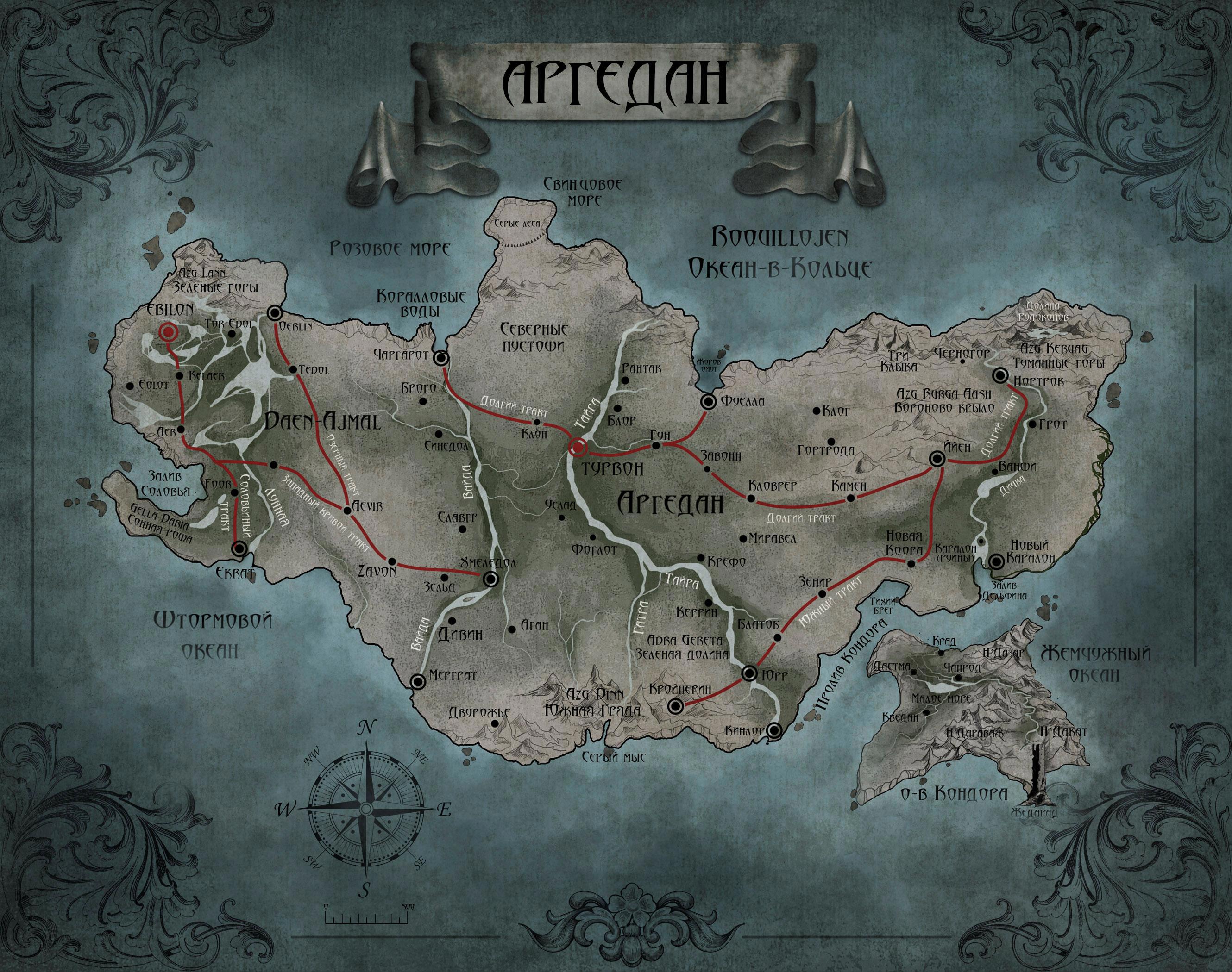 Фуэлла, Чаргарот и даэн-аймалский Оэрлин — три основных города-порта на севере Аргедана. Через них проходит сообщение с Малым Аргеданом и островами. Экрат, Мерграт, Кинлор и Новый Каралон на юге — это, по сути, морской побережный тракт. Южнее Аргедана плавать некуда, кроме как на остров Кондора.