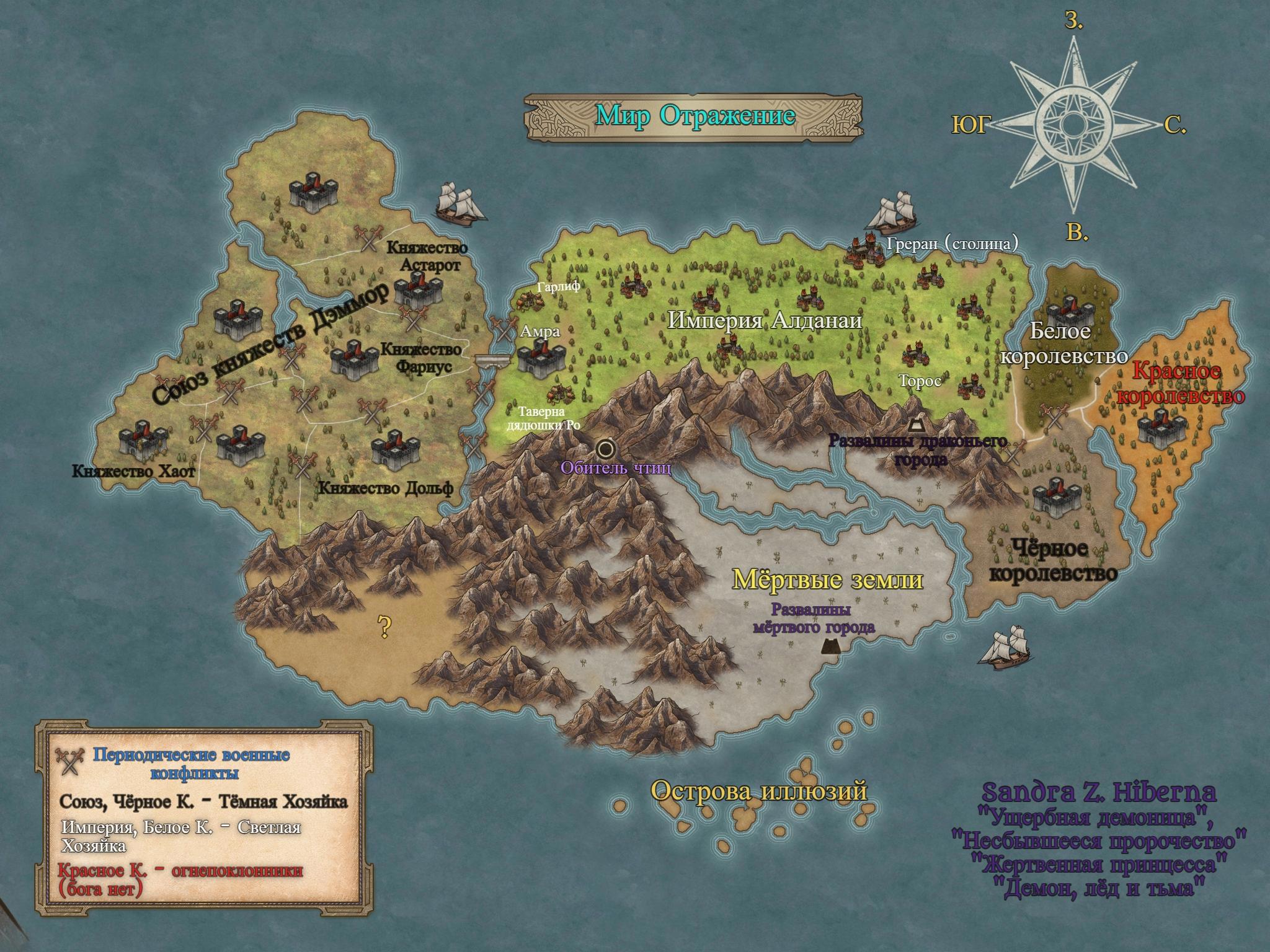 В данный момент я как раз работаю над романами по выдуманному мной миру - это мир Отражения. Почему он так называется? Ответ прост, но ущемляет гордость многих живущих в там. Мир Отражения считается, как видно из названия, перевернутой копией Изначального мира (но о нём в другой раз). Эти два мира были когда-то связаны системой порталов, и Изначальный мир использовал мир Отражения как сырьевой придаток. Но это нравилось далеко не всем, и более полутора тысяч лет назад к Светлая и Тёмная Хозяйки начали восхождение к власти. В результате магических манипуляций со своим телом и разумом они приобрели огромную мощь и смогли разрушить порталы, связывающие два мира.
