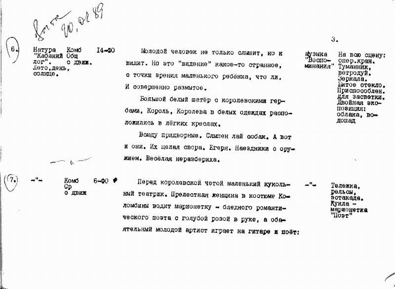 В художественной литературе всё иначе. Там нужно не просто передать диалог и перечислить основные действия героев, но и передать словами абсолютно всё – окружающую обстановку, эмоции людей, а то и животных, мысли этих людей, интонации, с которыми они говорят, общий эмоциональный настрой, который в фильме передаётся цветом и музыкой. Тут невозможно ограничиться просто «показыванием». Да и сценарии сейчас этим не ограничиваются. И киноповести тоже, они приближены к литературному описанию. Вот вам пример. Отрывок из киноповести Георгия Полонского «Не покидай» и два листа рабочего сценария, по которому снимал эту сказку Леонид Нечаев (весь сценарий я выложила в своём паблике в ВК ).