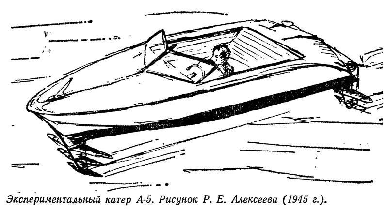 Катер весом почти в тонну и длиной в 11,8 метра имел двигатель всего 25 л.с., но разгонялся с ним до 30 км в час. На нём были установлены подводные крылья с искусственной регулировкой угла атаки. Это был очень хороший опыт, но Алексеев со своим соратником Леонидом Поповым не остановились. После А-4 Алексеев продолжает исследования и строит новый катер. А-5, построенный в 1945 году, внешне был не похож на предыдущую машину. Рисунок Алексеева: