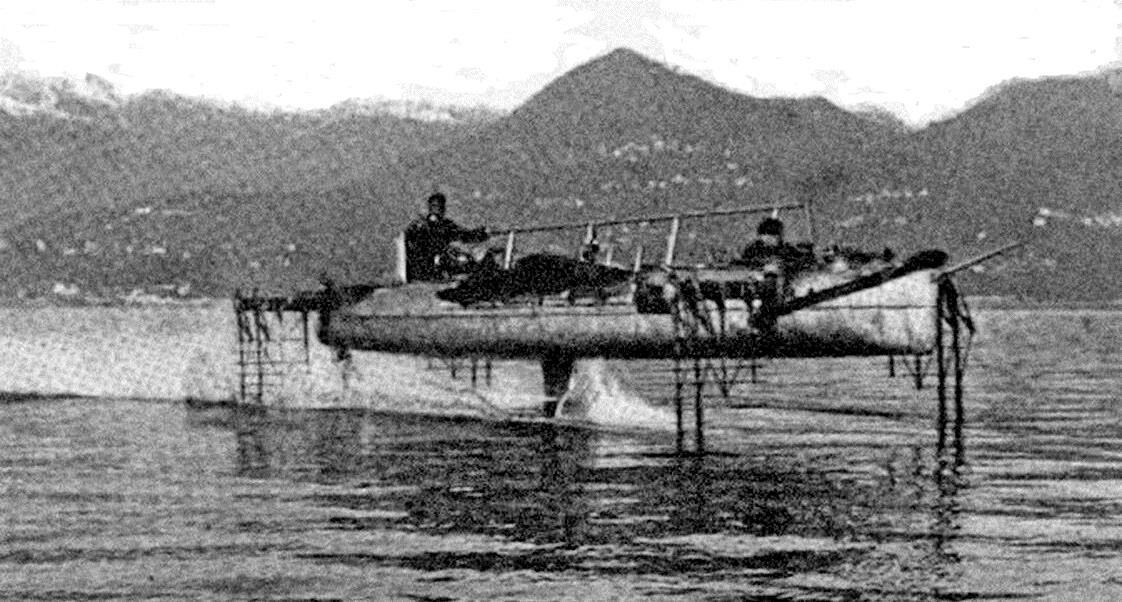 Насмотревшись на опыты Энрике, его земляк, Артуро Крокко задумался и предложил другое решение проблемы. Он не стал строить этажерки из маленьких крыльев, а просто большие крылья поставил под углом в виде буквы V. Теперь уменьшение площади стало не ступенчатым, а плавным. Понятно, что в целом подъёмная сила крыльев при этом снижалась, а сопротивление росло, однако не настолько, чтобы отказываться от положительной составляющей конструкции. Проблему движителя Крокко со своим коллегой Риканольди решили просто, как и Энрике они поставили воздушный винт. Для Крокко это вообще было естественным вариантом – ведь он был авиатором. В 1907 году судно, которое построили друзья, с двигателем в 80 л.с. вышло на крылья и разогналось до скорости в 70 км в час. Отлично!